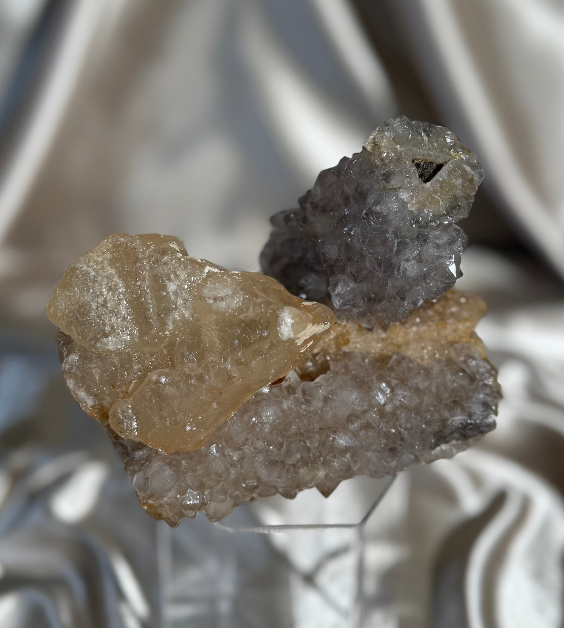 This striking specimen feature amethyst stalactites with sugary calcite, sourced from the mineral-rich regions of Madhya Pradesh, India. Each piece showcases a beautiful contrast between the saturated amethyst and the slightly dissolved calcite, creating a truly eye-catching display.