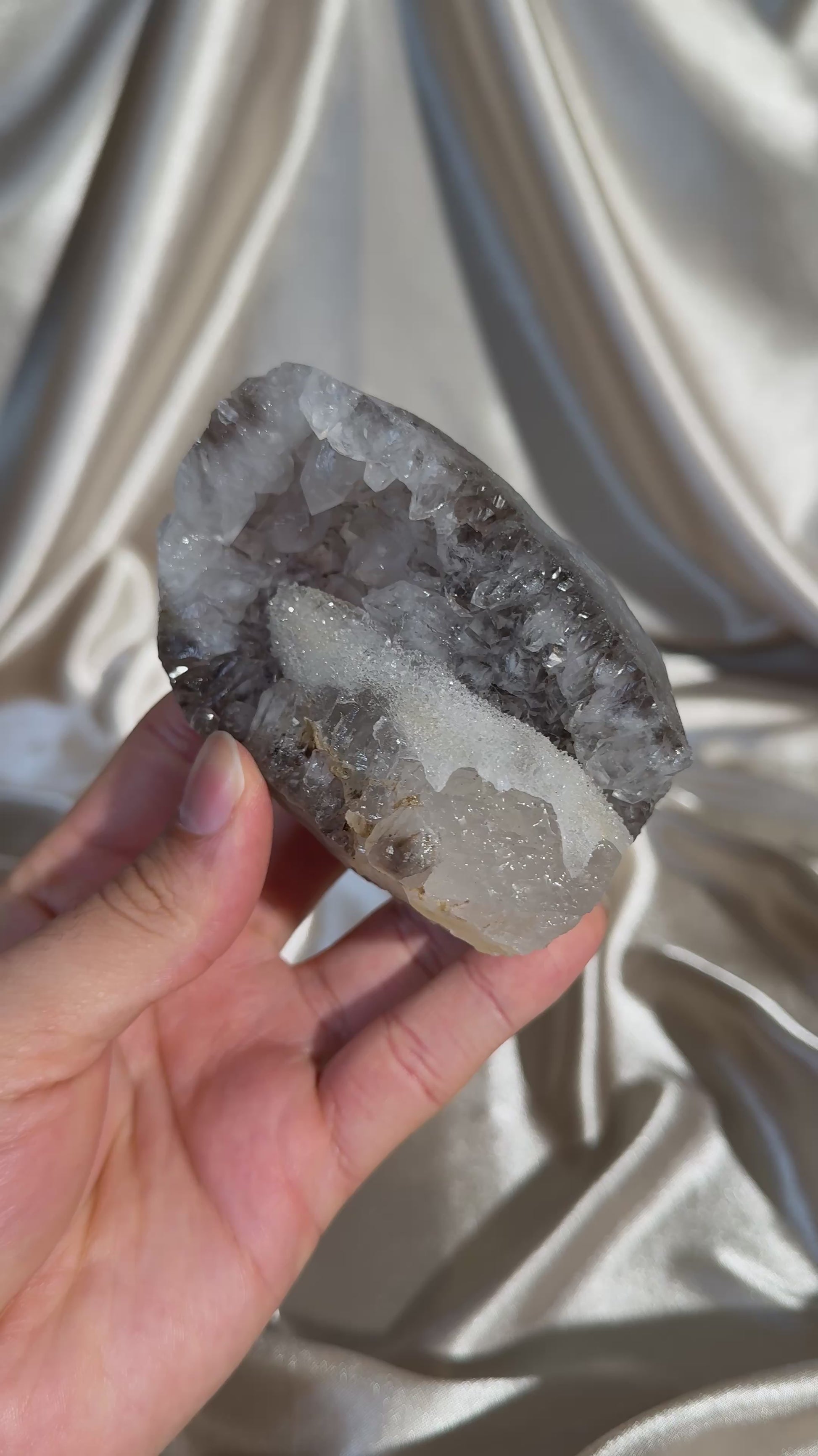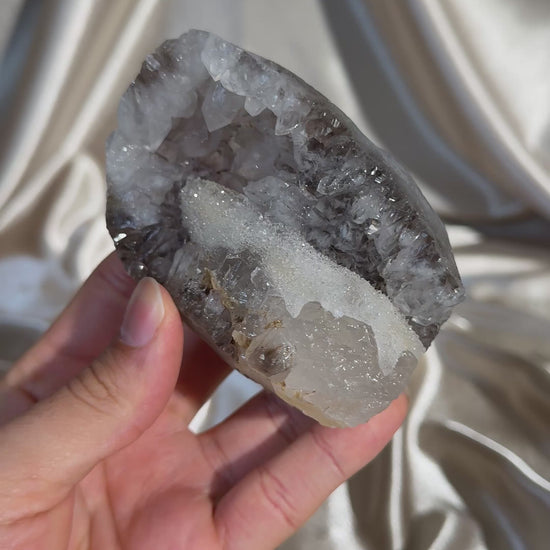 This specimen features amethyst with a sugary calcite point, sourced from the mineral-rich regions of Madhya Pradesh, India. Each piece showcases a beautiful contrast between the saturated amethyst and the slightly dissolved calcite, creating a truly eye-catching display.