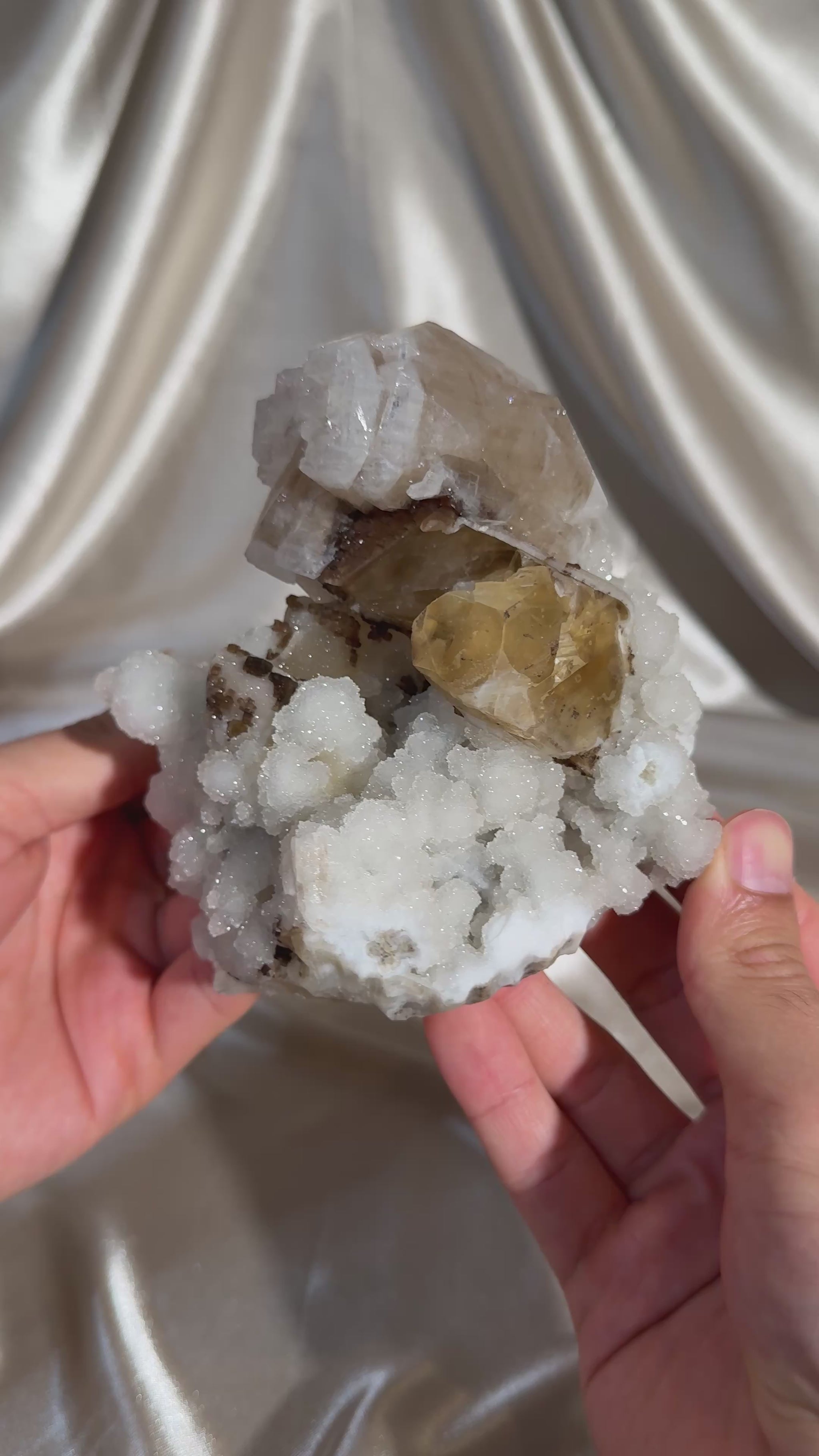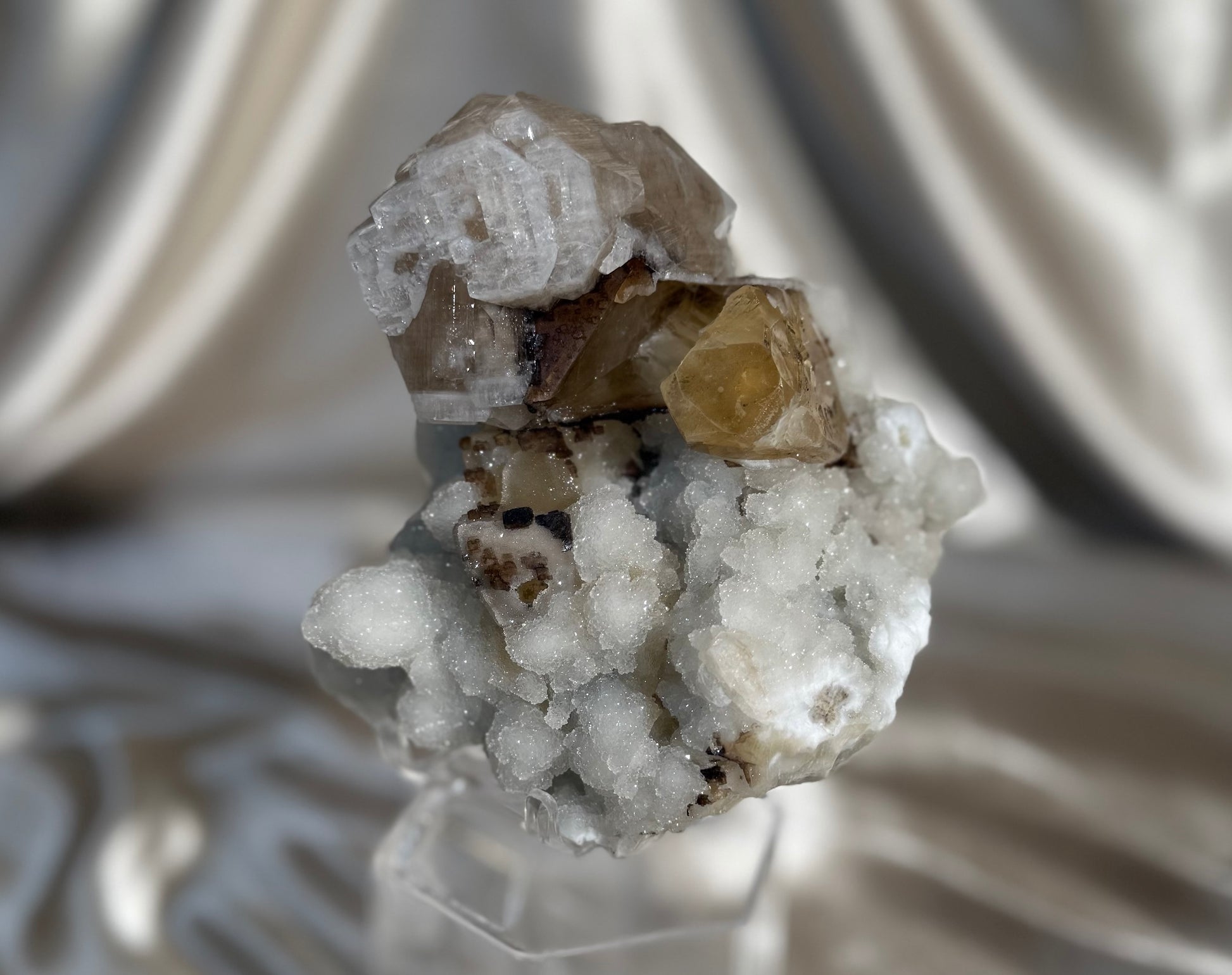 Honey calcite formations capped with apophyllite on a white chalcedony base. The apophyllite displays uncommon, intricate etchings, and small dark brown honey calcite grows at the base, adding subtle contrast to the piece.