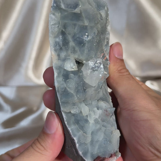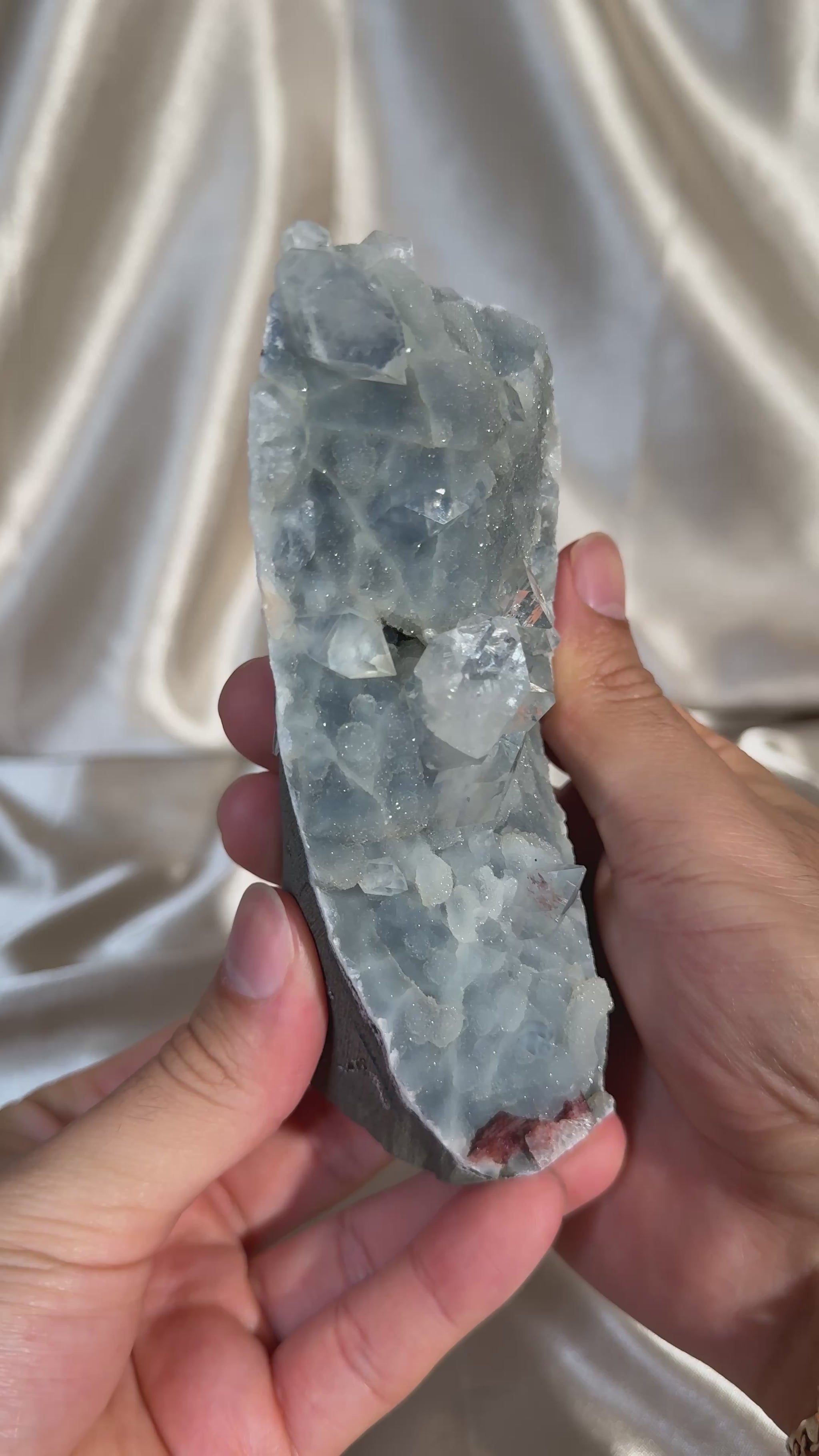 A beautiful specimen featuring blue chalcedony contrasted by gemmy apophyllite crystals. The high luster and clarity of the apophyllite give it a diamond-like brilliance hence their name.