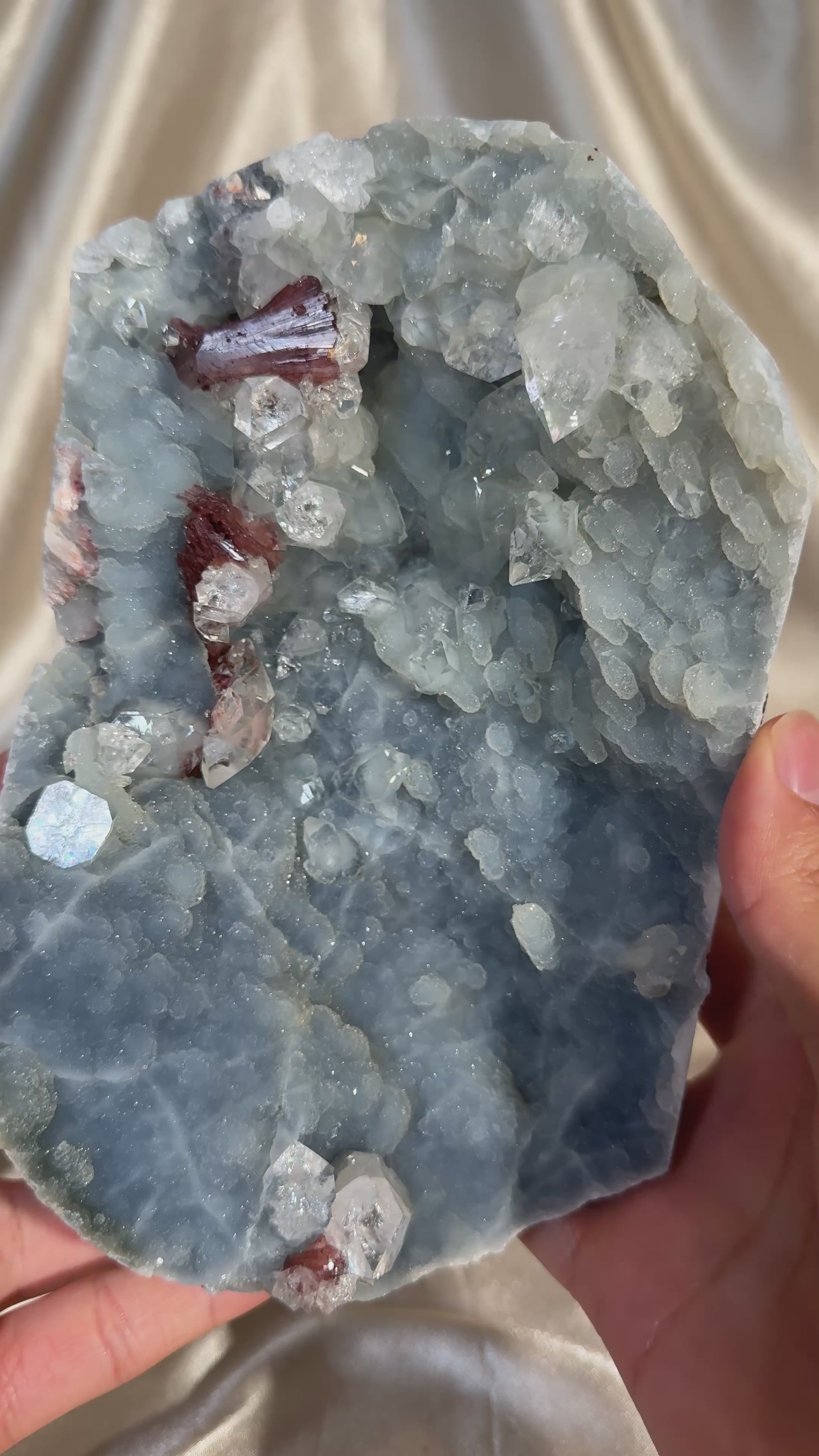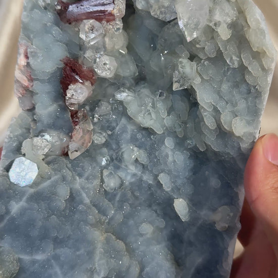 A beautiful specimen featuring blue chalcedony contrasted by gemmy apophyllite crystals, stilbite & red heulandite. The high luster and clarity of the apophyllite give it a diamond-like brilliance hence their name.