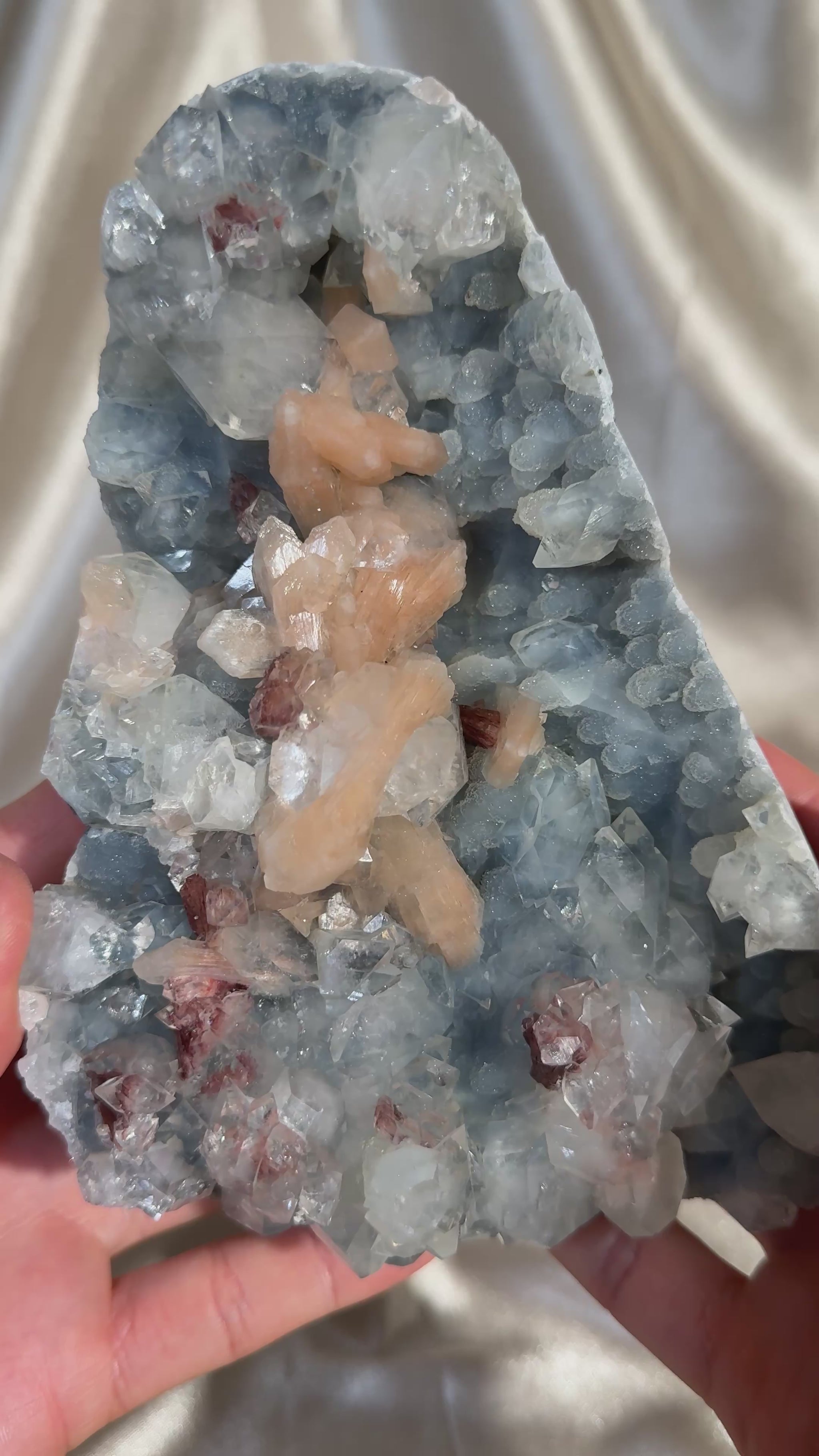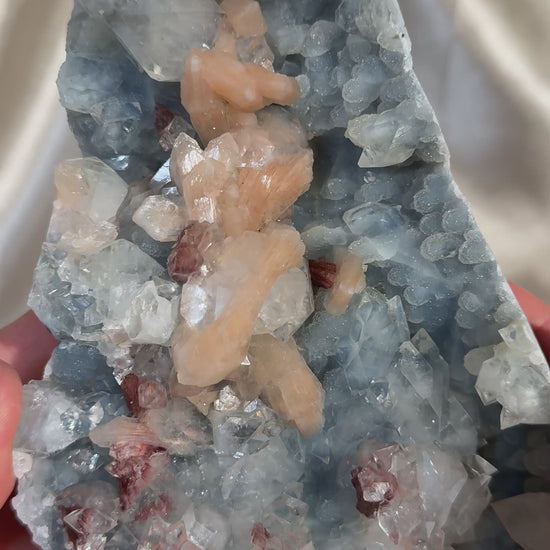 A vibrant specimen featuring blue chalcedony with diamond apophyllite crystals, peach stilbite, red heulandite.