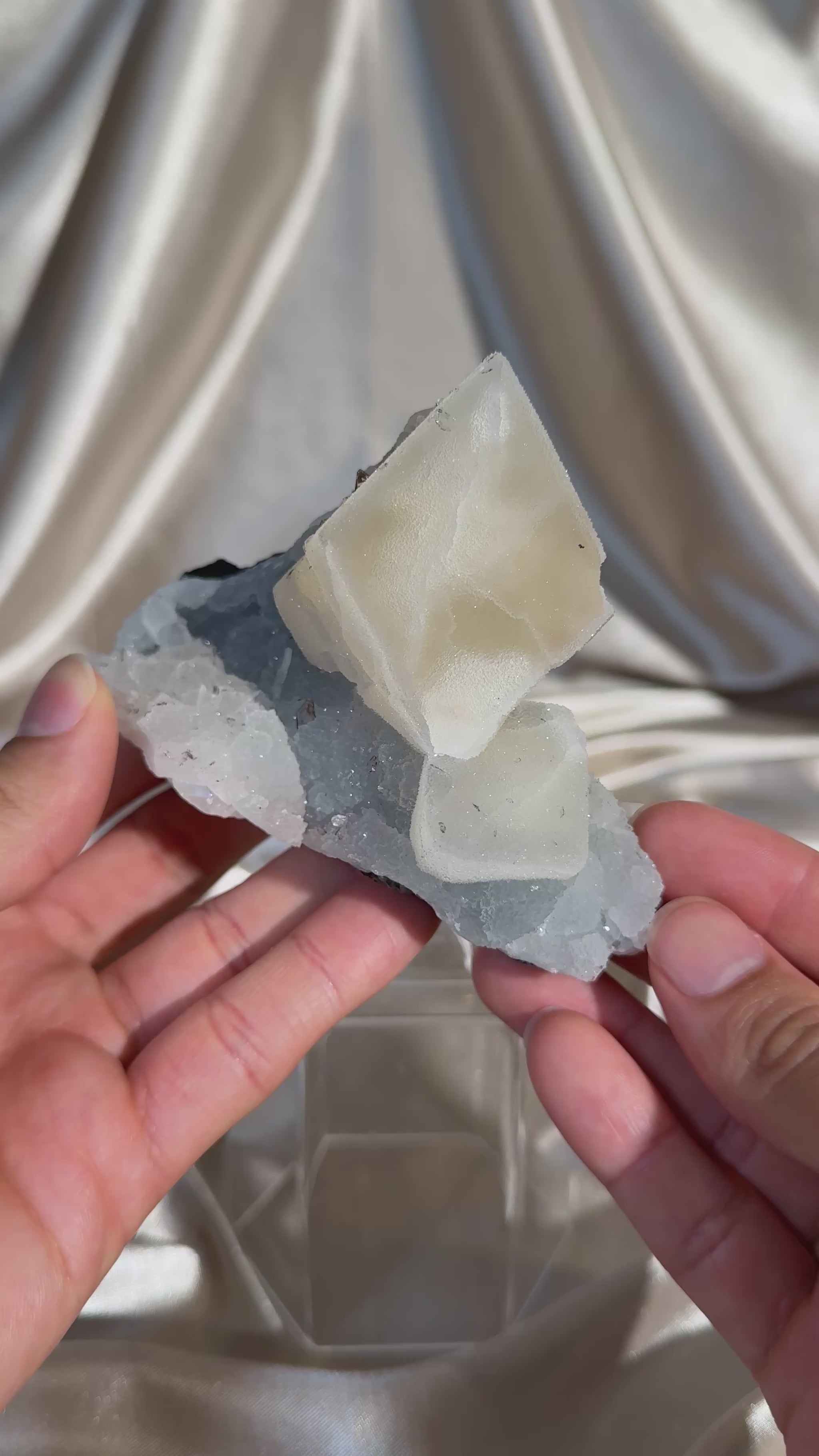 This is a stunning specimen featuring blue chalcedony with calcite that has been fully coated in chalcedony. The calcite have a unique diamond shape which I love as a collector. There is also red small red heulandite growth over the calcite.