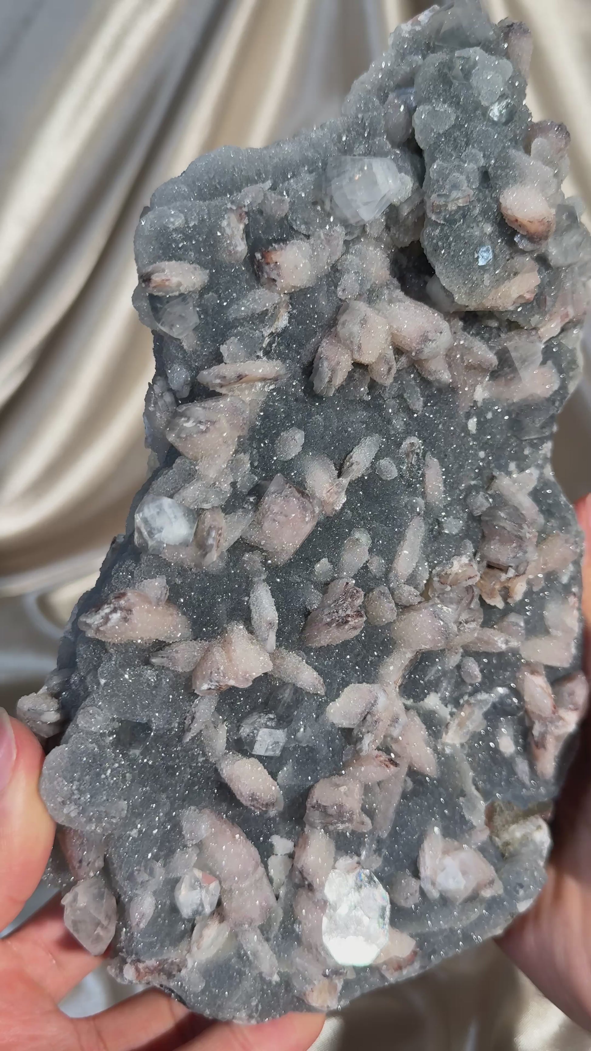 Dark blue chalcedony with red phantom stilbite that has been coated over in the chalcedony. There is also some apophyllite, one of the apophyllite has a cleave which is slight damage - subtle but worth noting.