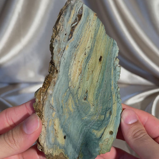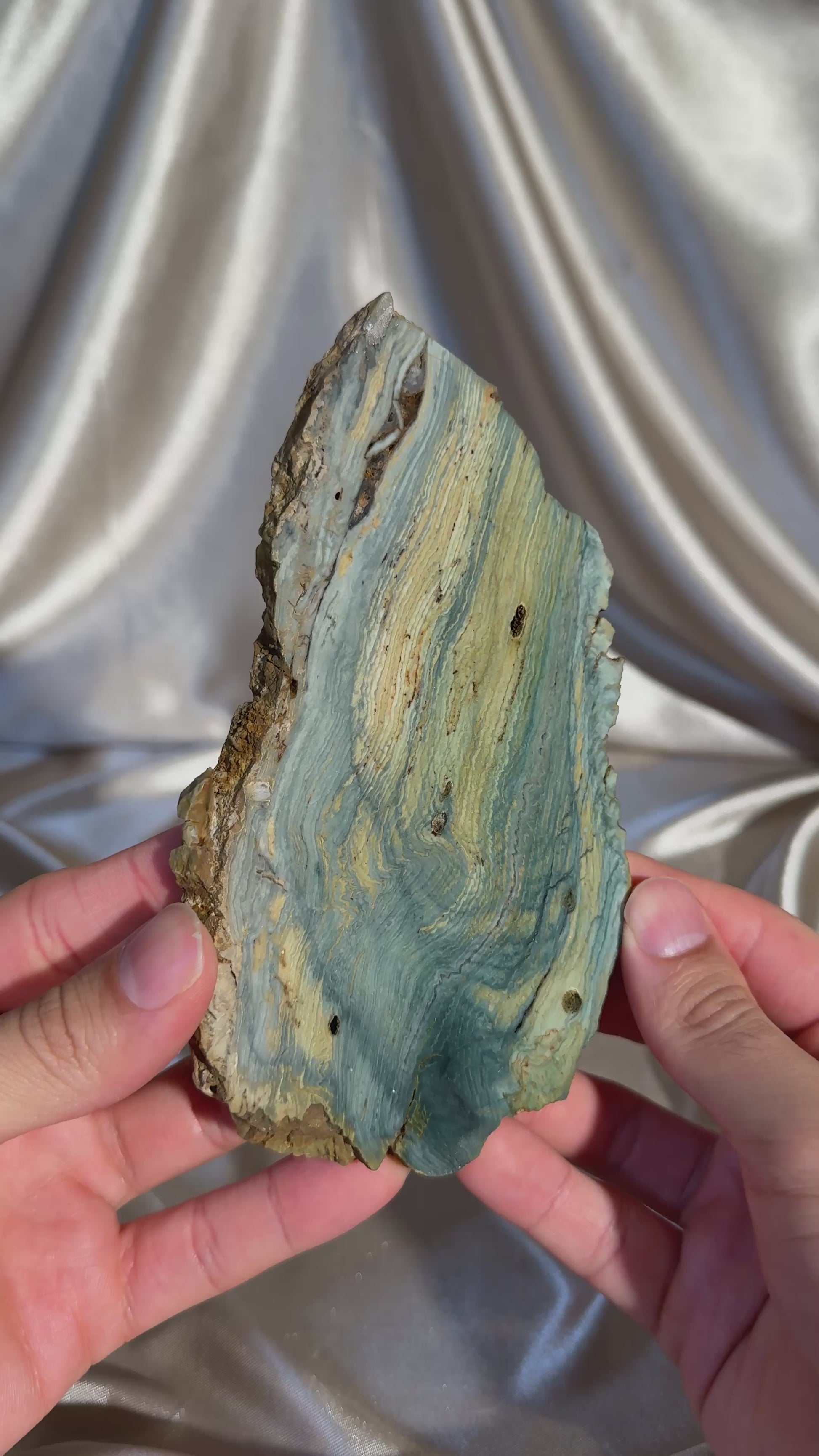 This striking polished slab a fine example of Gary Green Jasper, also known as Larsonite or Bogwood, sourced from the McDermitt region of Nevada and other regions in Oregon near the Nevada border. Its deep, vibrant green coloration is interlaced with intricate patterns and subtle banding, characteristic of this uncommon jasper variety. The dense, polished surfaces highlight the stone’s natural luster, while the earthy tones and textural variation reflect its volcanic and sedimentary origins. Ancient trees in a boggy environment were covered by volcanic ash and debris. Over millions of years it leaves this beautiful piece.