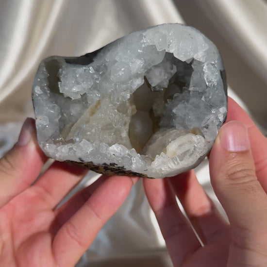 Calcite on quartz with uncommon botryoidal fluorite. The fluorite displays an uncommon formation highly prized by collectors, while the quartz rests on a layer of blue chalcedony, giving the entire piece a subtle bluish hue.