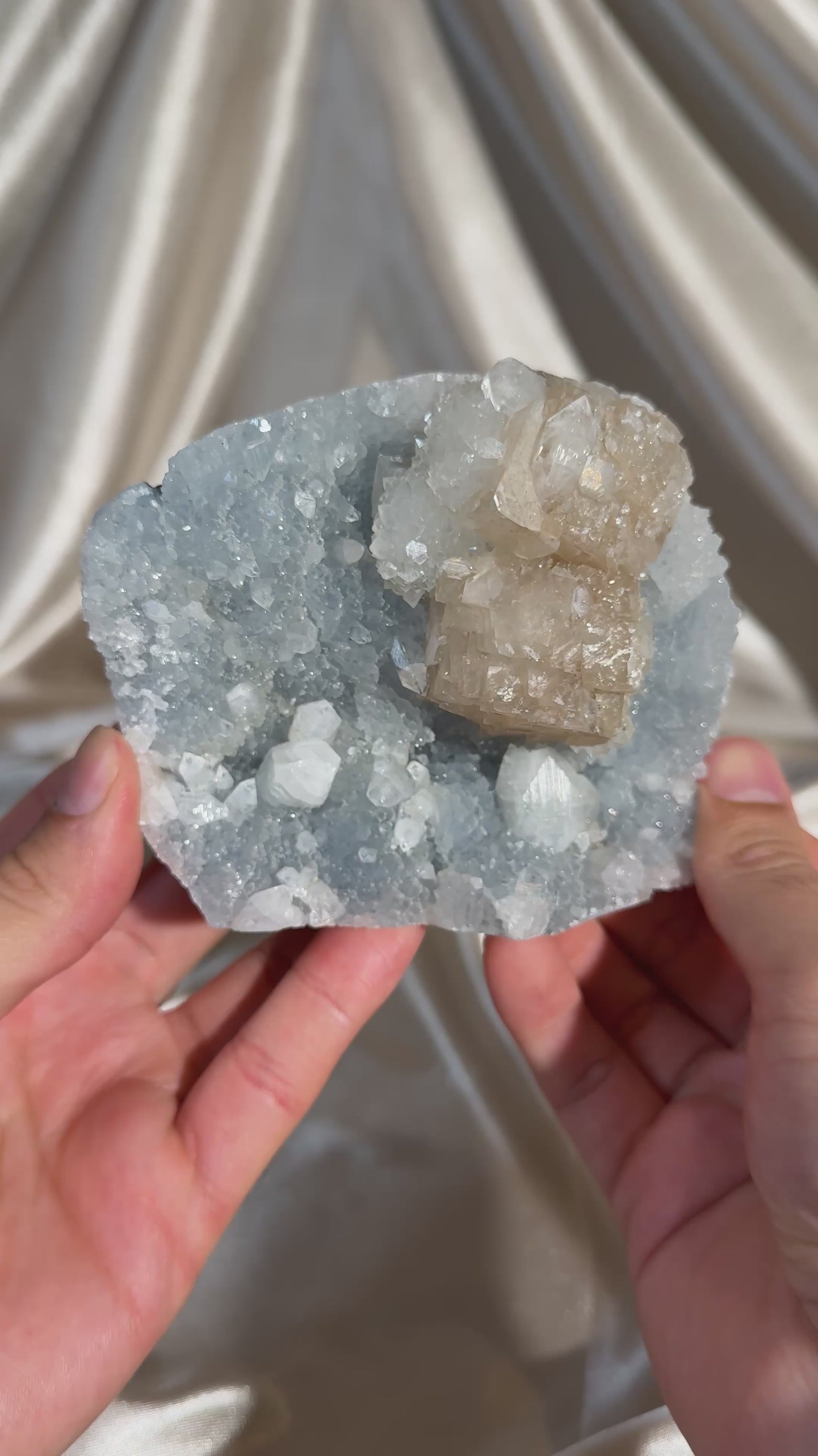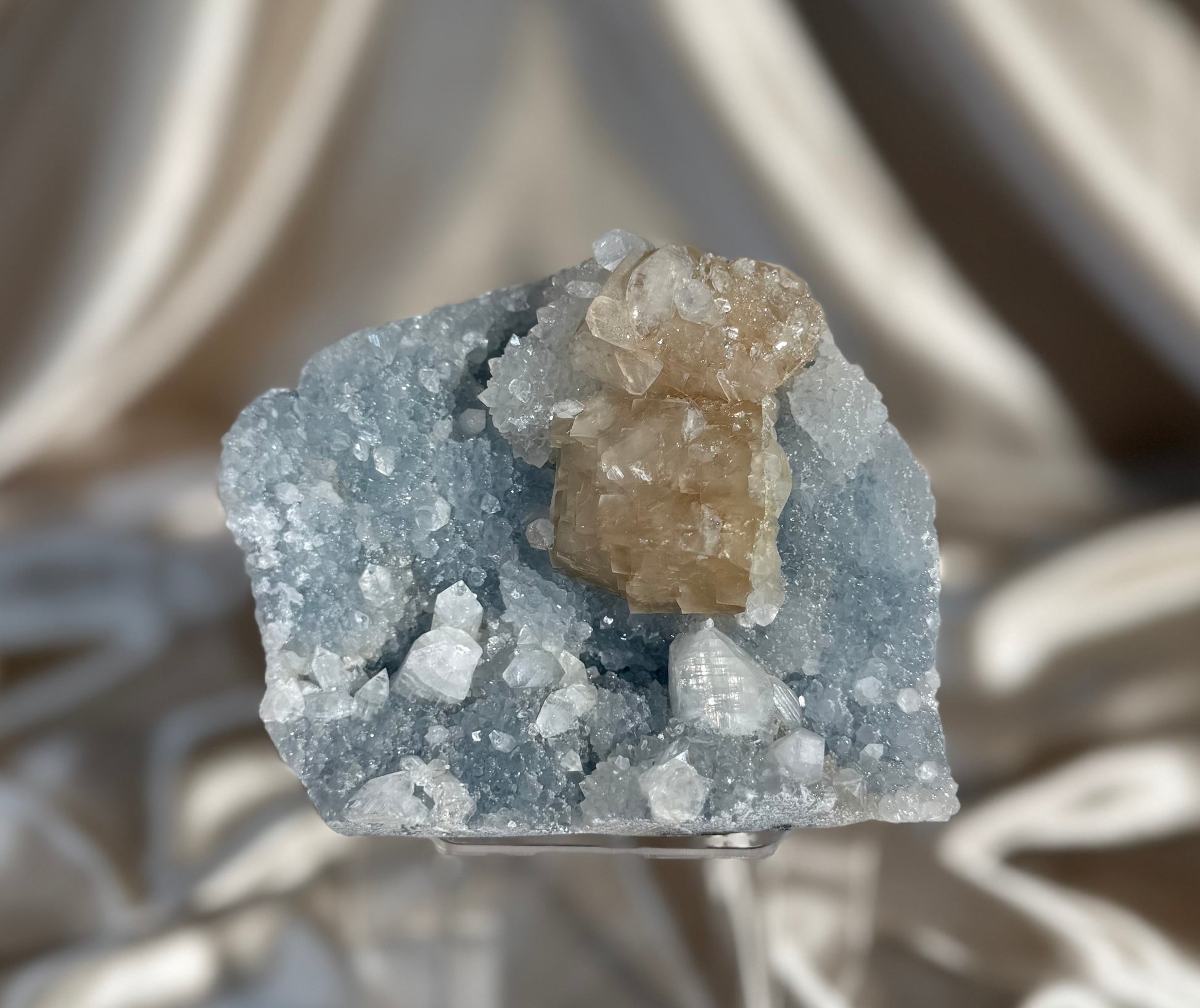 This eye-catching specimen features honey calcite on blue chalcedony, with apophyllite crystals. There is apophyllite both in the chalcedony and the calcite.