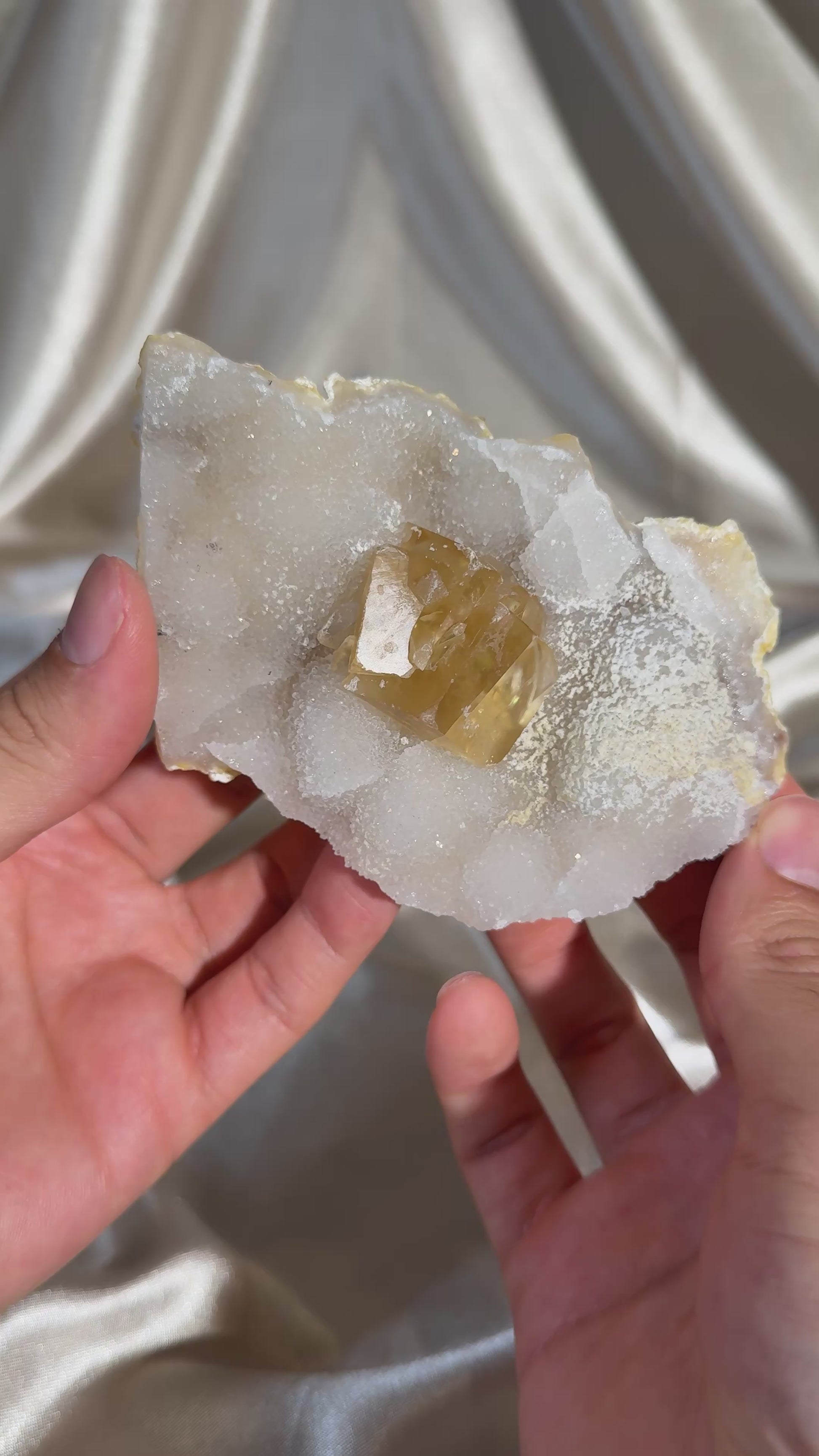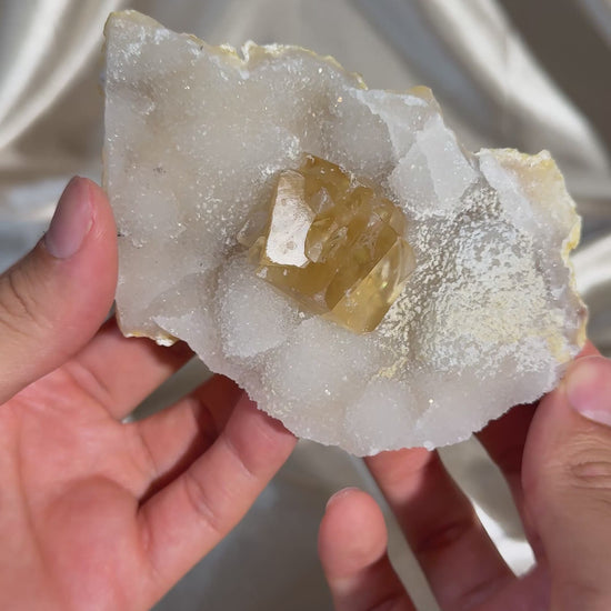 A beautiful collector’s specimen featuring rich honey calcite on a chalcedony base. The calcite’s warm, golden hues and natural crystal formations stand out against the chalcedony’s subtle, textured surface, making this piece standout for display.