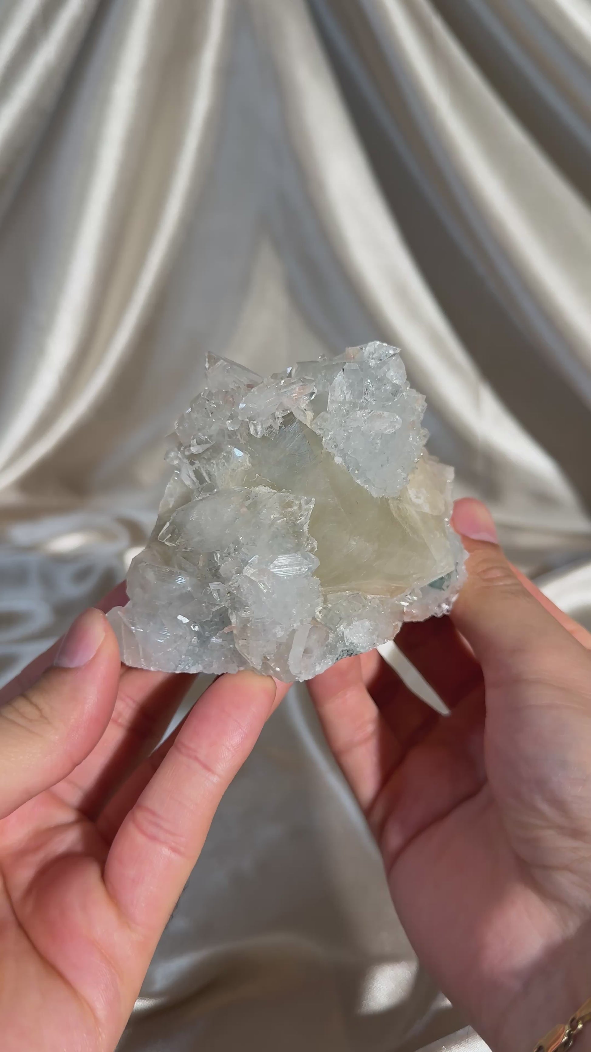 A beautiful calcite formation on sparkling quartz, with diamond apophyllite crystals. The calcite pops against the glittering quartz, and the subtle sparkle of the apophyllite brings the whole piece to life. It’s a naturally stunning specimen that’s perfect for collectors or anyone who loves unique pieces.