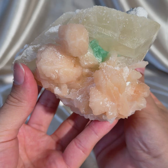 Calcite with flowered pointed green apophyllite and peach stilbite. The combination of colors and formations creates a visually striking piece with exceptional aesthetic appeal. This specimen comed from the Jalgaon District in the Deccan Traps of India, a region renowned for producing some of the world’s finest mineral specimens.