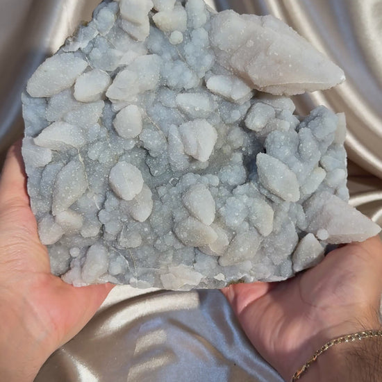 This small, limited pocket produced sharply defined scalenohedral (“dogtooth”) Calcite crystals that have been completely overgrown by a fine layer of Chalcedony. The Chalcedony, a microcrystalline variety of Quartz, is exceptionally fine here, creating a “sugared” texture across the crystal faces.