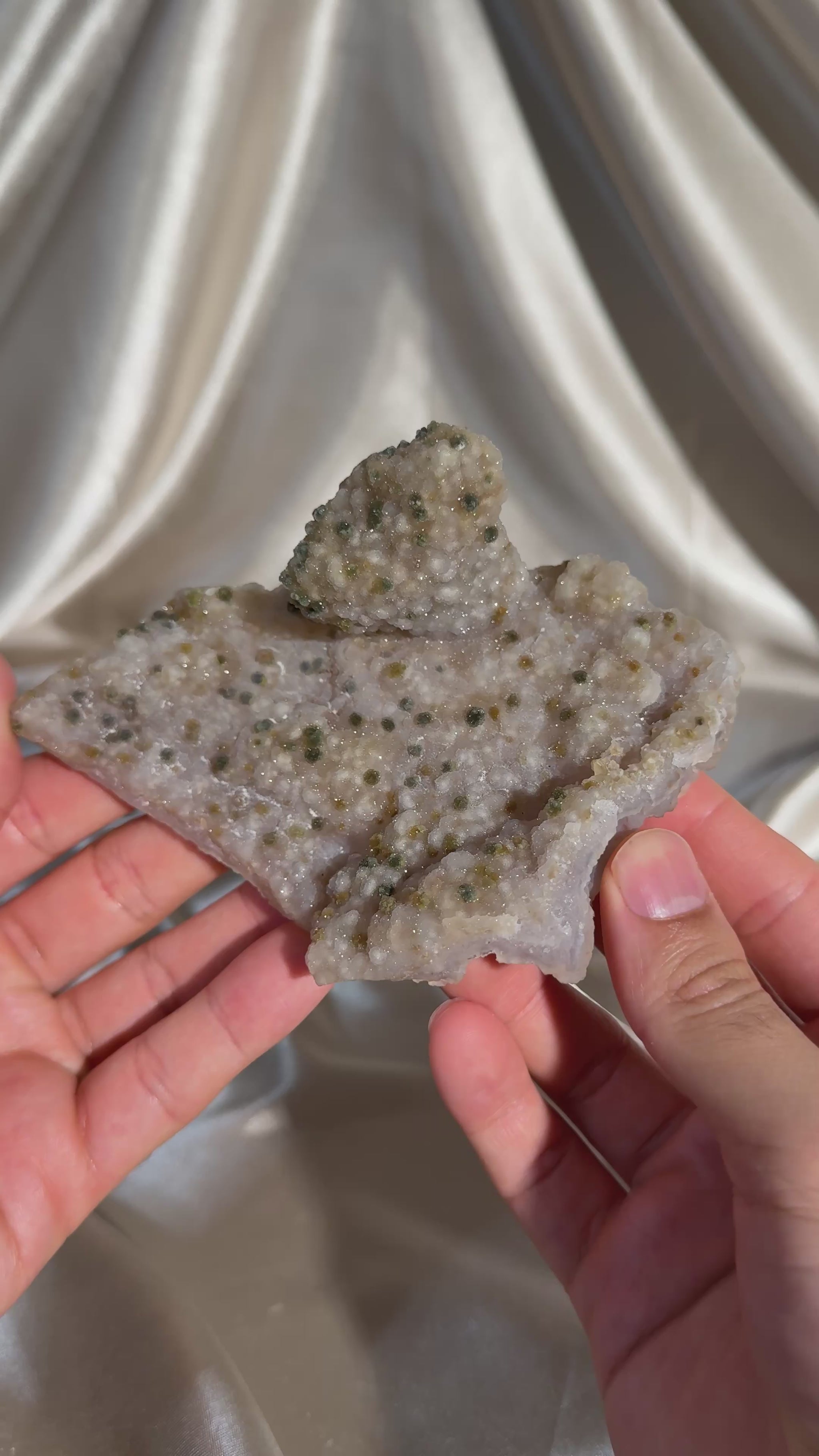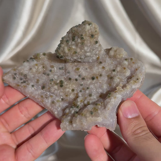 Chalcedony-coated calcite featuring uncommon julgoldite inclusions. The calcite is fully coated in a sparkling, sugary chalcedony layer, while the julgoldite creates a unique polka-dot effect across the surface.