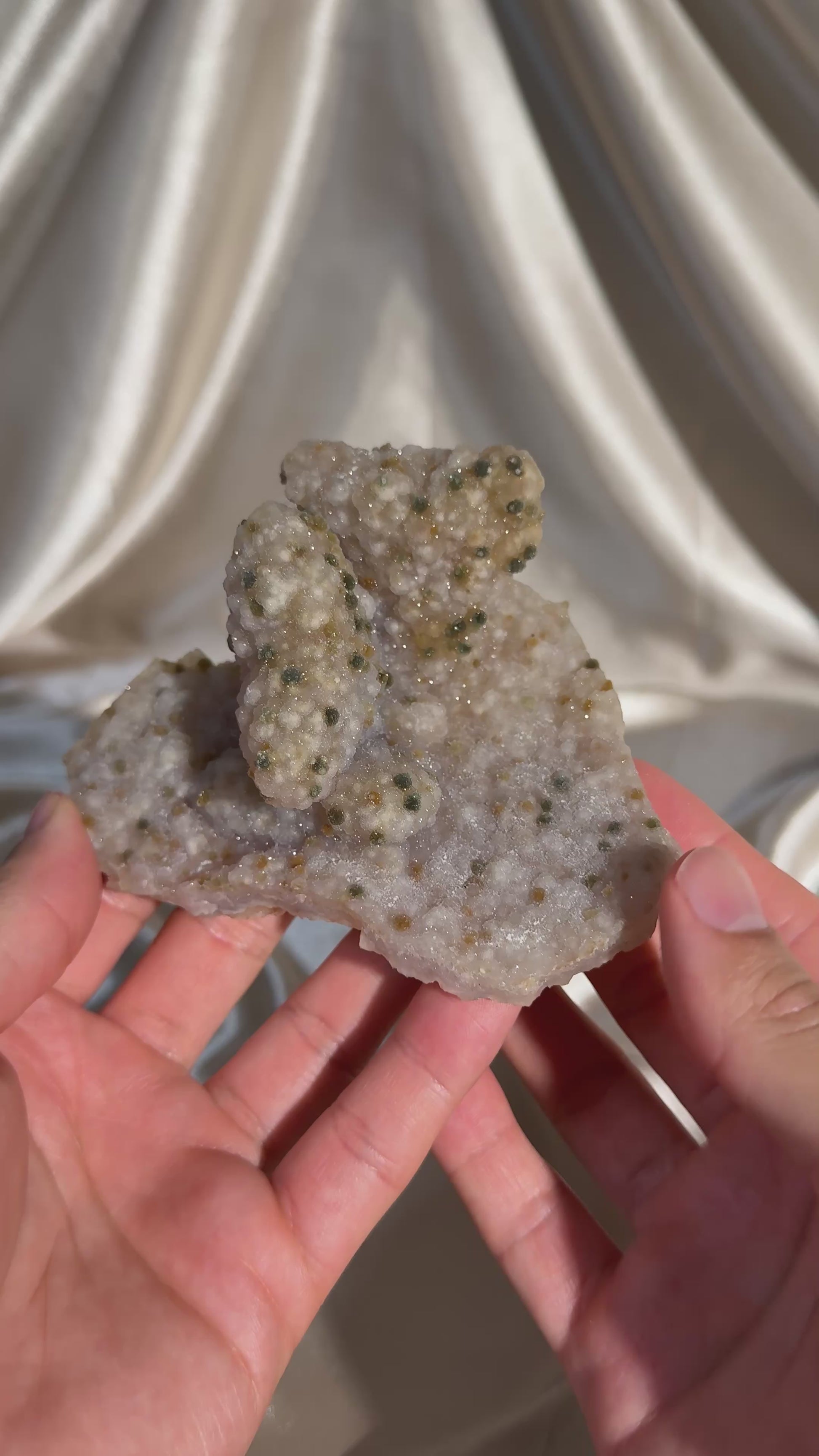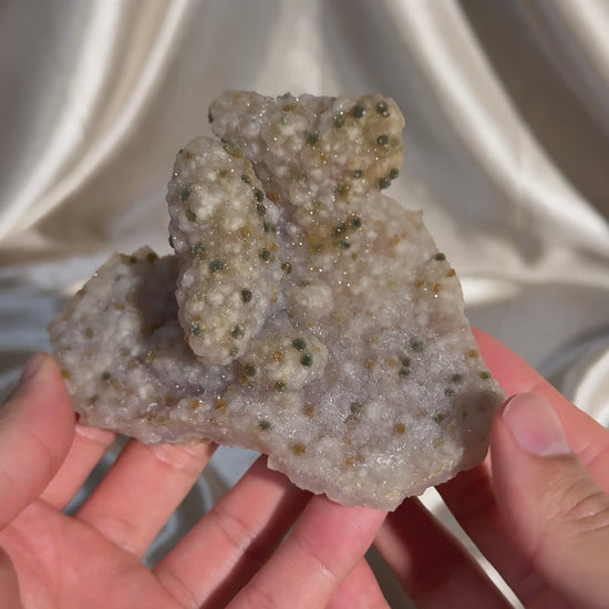 Chalcedony-coated calcite featuring uncommon julgoldite inclusions. The calcite is fully coated in a sparkling, sugary chalcedony layer, while the julgoldite creates a unique polka-dot effect across the surface.