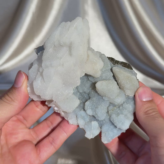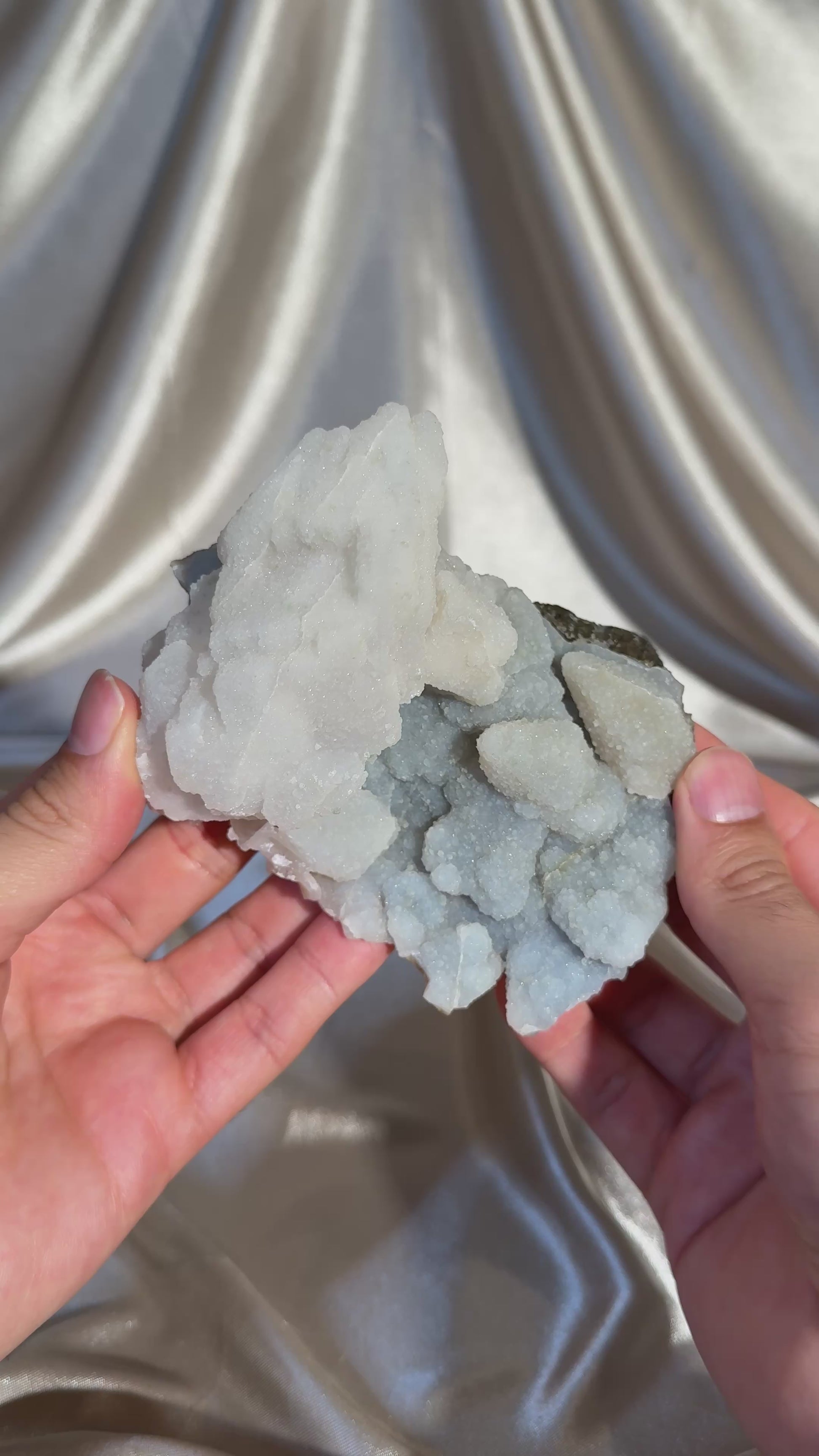 This small, limited pocket produced sharply defined scalenohedral (“dogtooth”) Calcite crystals that have been completely overgrown by a fine layer of Chalcedony. The Chalcedony, a microcrystalline variety of Quartz, is exceptionally fine here, creating a “sugared” texture across the crystal faces.