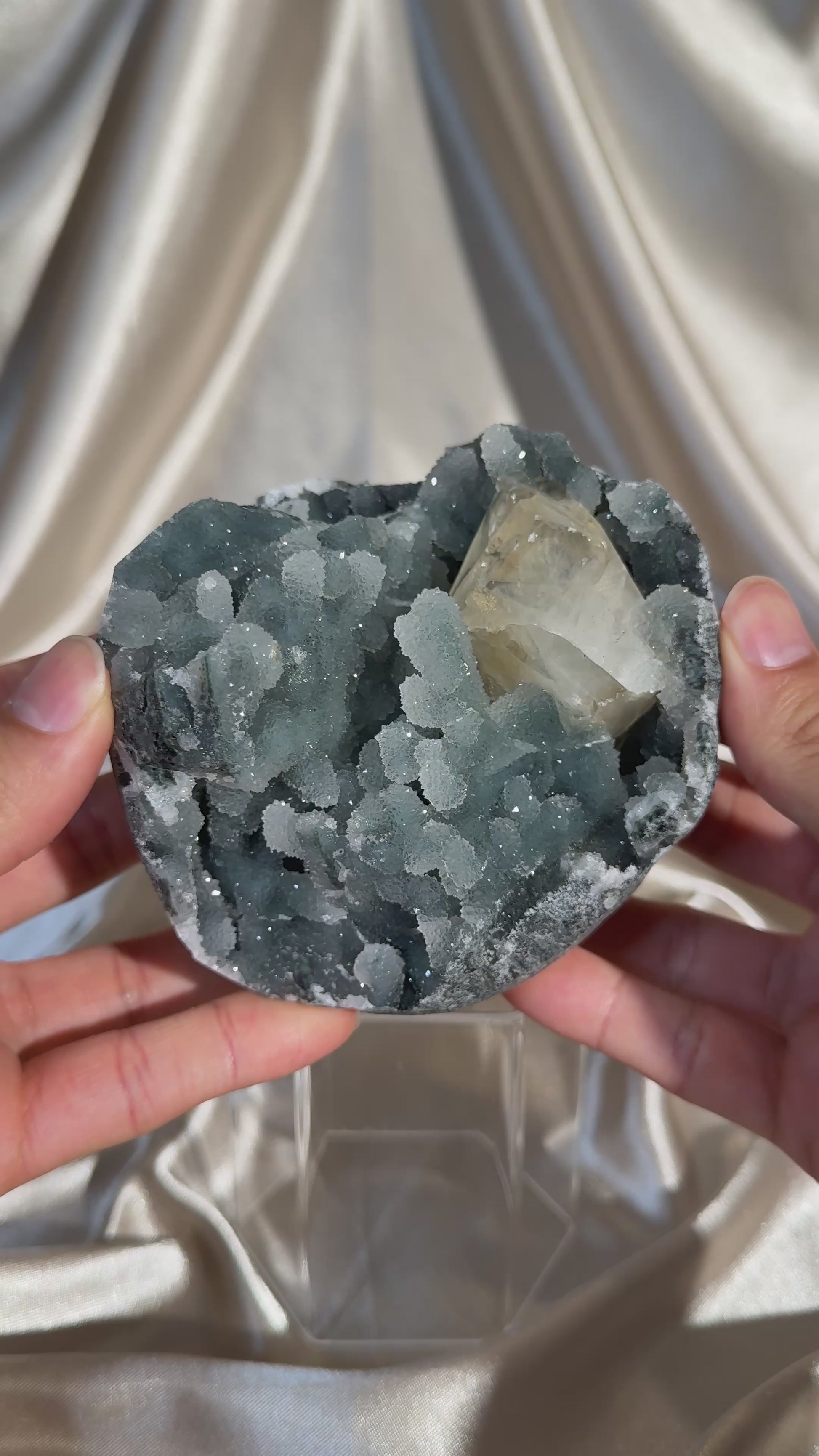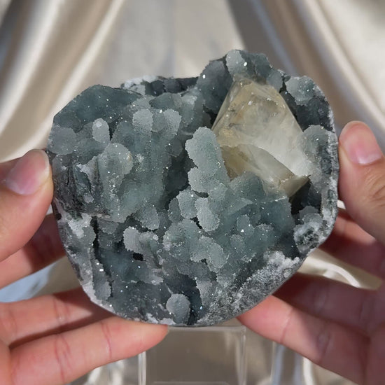 Exceptional stalactitic chalcedony specimens exhibiting a rare greenish-blue hue, with honey calcite. Originating from the basaltic cavities of the Deccan Traps, these pieces highlight the region’s remarkable secondary mineralization. An outstanding addition for collectors of Indian mineral specimens.