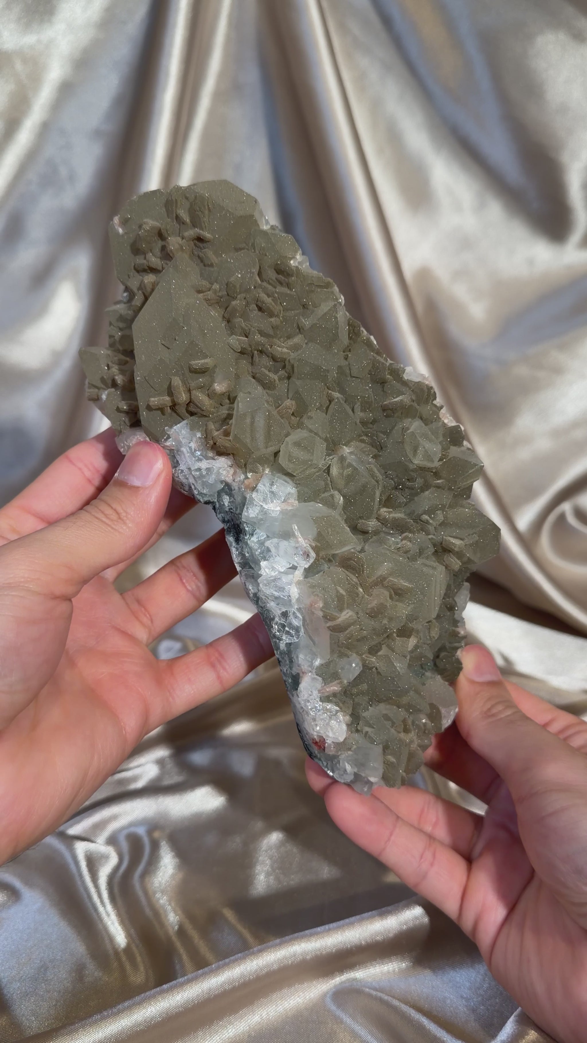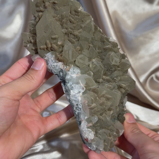 Chlorite dusted ‘diamond’ apophyllite from the Jalgaon District, India. The fine layer of chlorite over the crystals creates a beautiful sugary sparkle and gives the piece its soft matcha green tone.