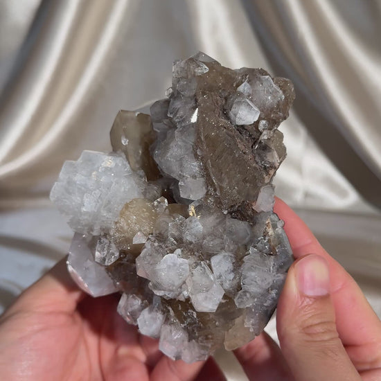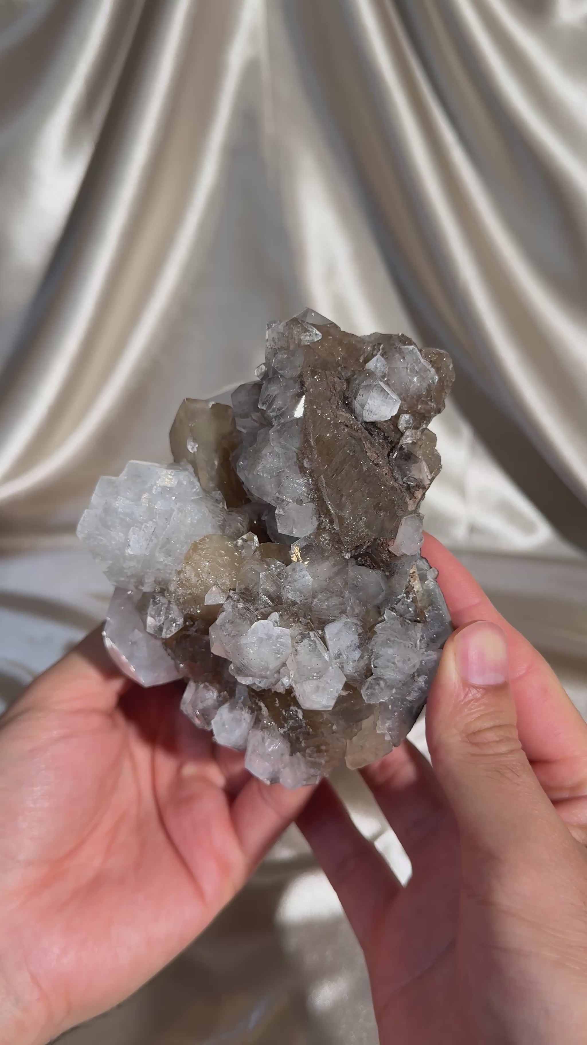 Dark honey calcite with a sugary coating and distinctive apophyllite growth. The piece shows multiple generations of calcite formation, with the apophyllite featuring unique etchings at the tips and a slight chalcedony coating that adds a subtle sparkle.