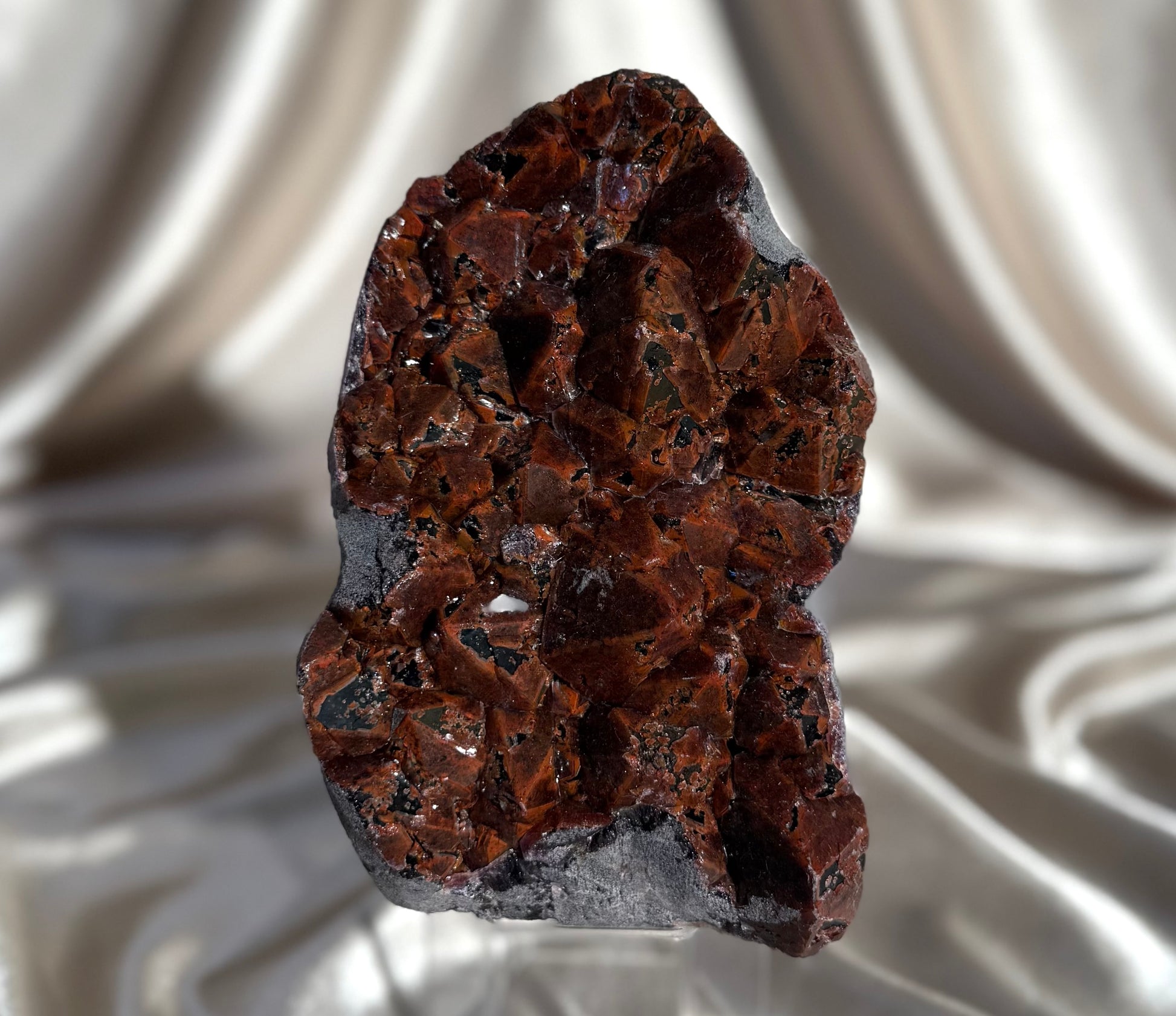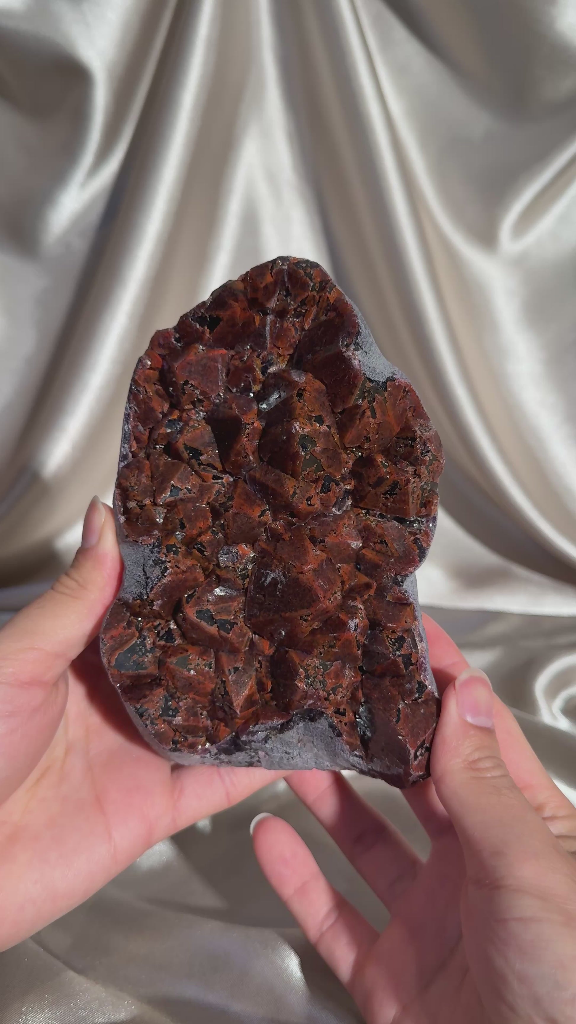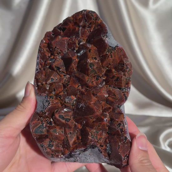 Hematite-capped amethyst with beautiful elestial formations. The thick hematite layer creates that deep red coloration, giving each piece a fiery, dramatic look. Sourced from the Hyderabad region of India and trade named “Dragon’s Breath” amethyst for its bold, glowing appearance.
