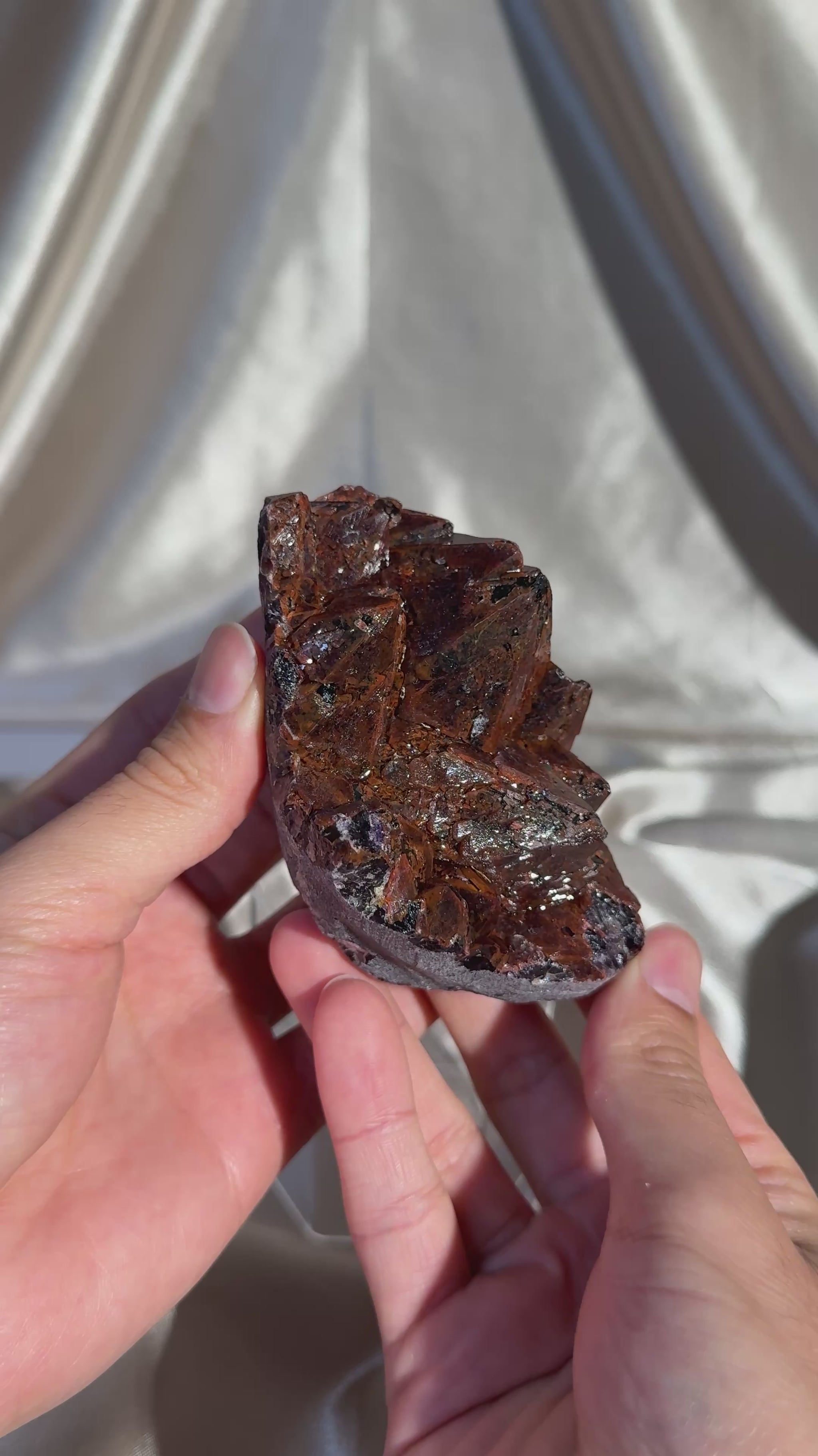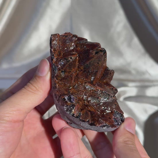 Hematite-capped amethyst with beautiful elestial formations. The thick hematite layer creates that deep red coloration, giving each piece a fiery, dramatic look. Sourced from the Hyderabad region of India and trade named “Dragon’s Breath” amethyst for its bold, glowing appearance.