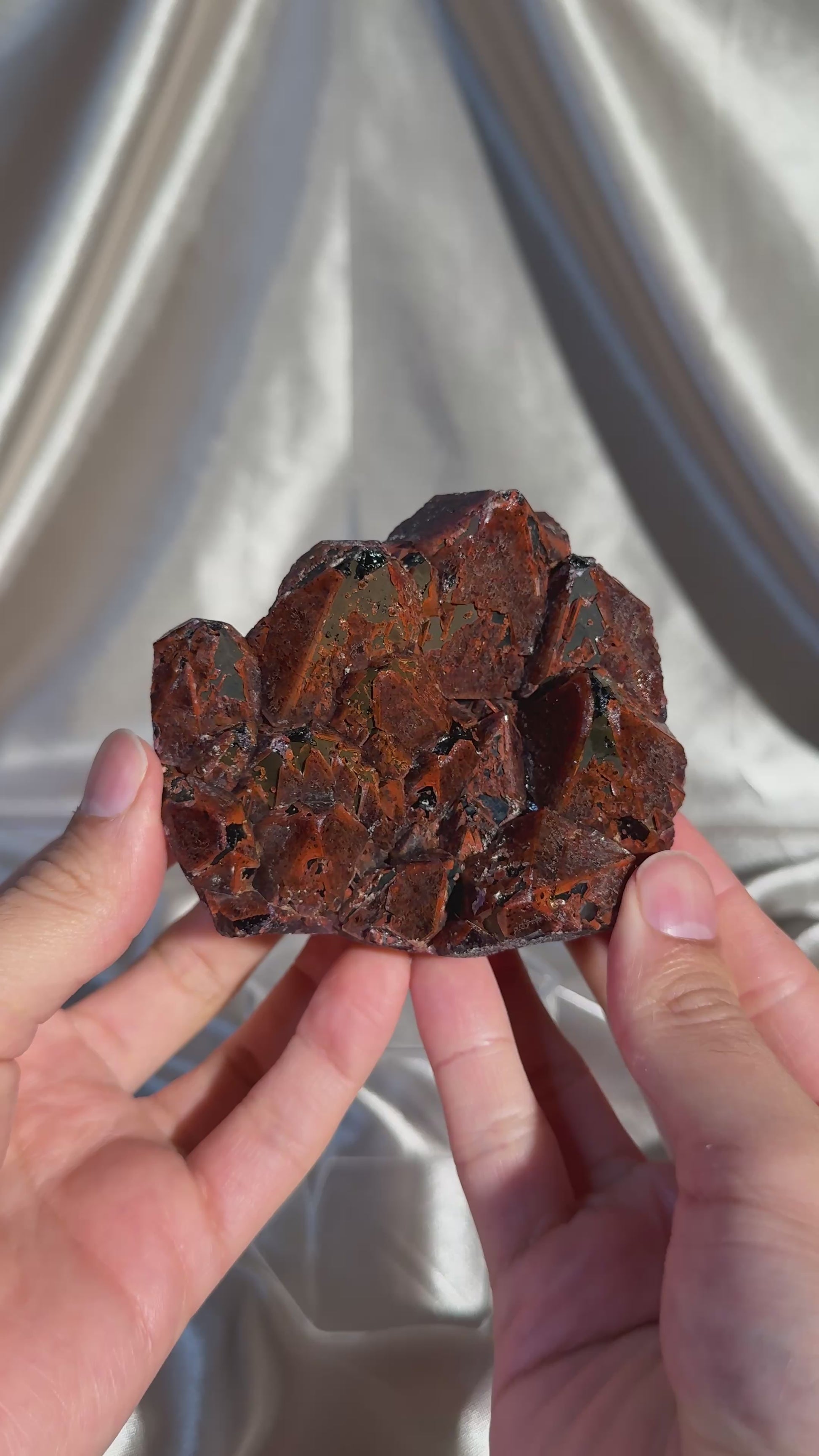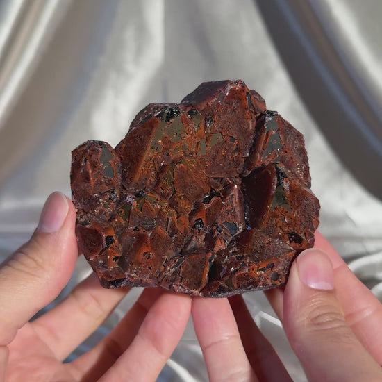 Hematite-capped amethyst with beautiful elestial formations. The thick hematite layer creates that deep red coloration, giving each piece a fiery, dramatic look. Sourced from the Hyderabad region of India and trade named “Dragon’s Breath” amethyst for its bold, glowing appearance.