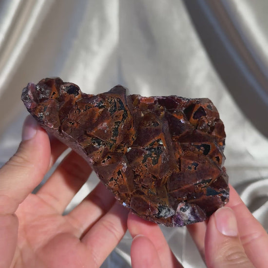 Hematite-capped amethyst with beautiful elestial formations. The thick hematite layer creates that deep red coloration, giving each piece a fiery, dramatic look. Sourced from the Hyderabad region of India and trade named “Dragon’s Breath” amethyst for its bold, glowing appearance.