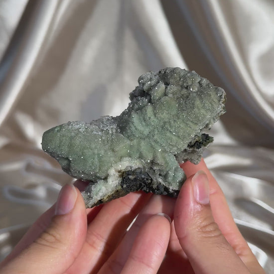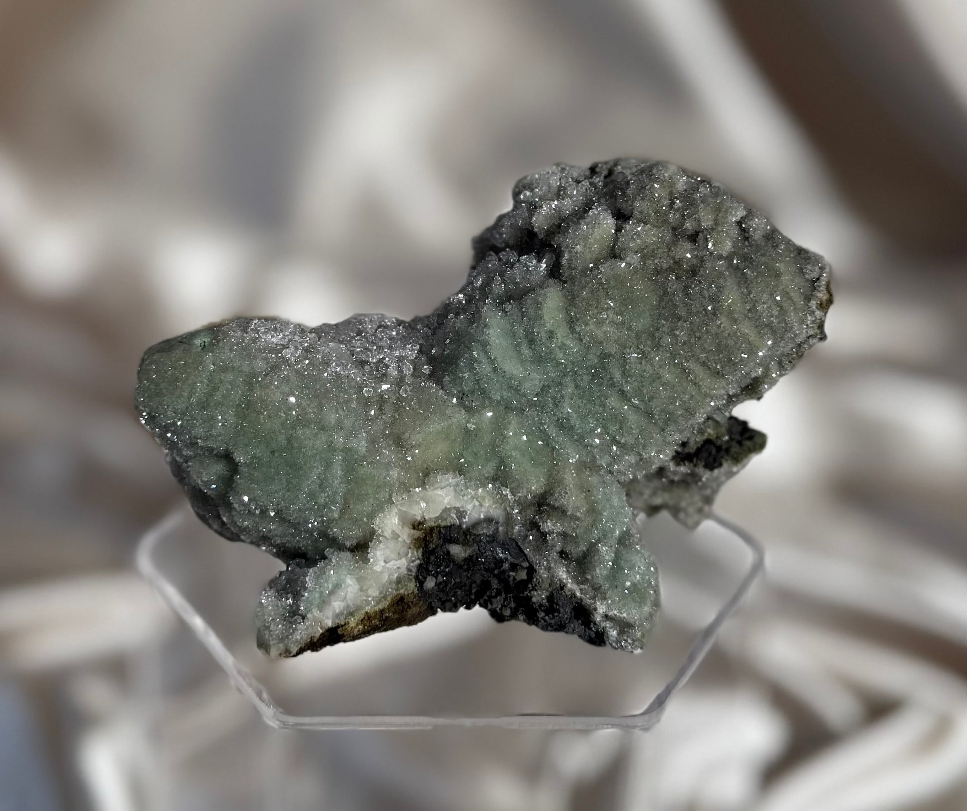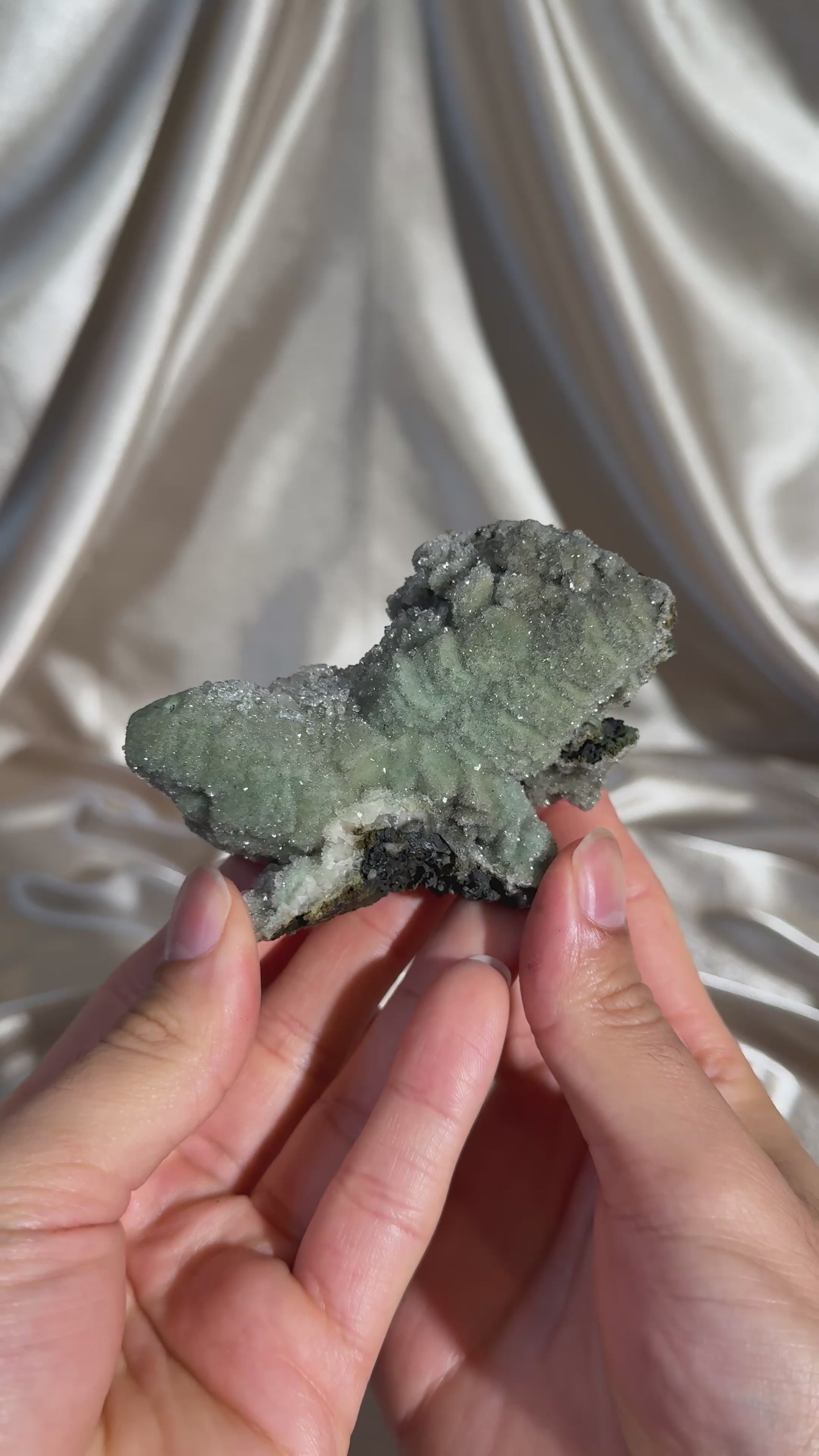 A recent discovery, trade-named Fairy Moss by me, this pocket showcases an unusual stacked Calcite formation reminiscent of the pagoda-style Calcite from China. The primary Calcite crystals are coated with a fine layer of Chalcedony (microcrystalline Quartz), which contains Chlorite inclusions giving a green hue. A second generation of small, transparent Calcite crystals grew over the surface, creating intricate layering. The combination of rare stacking morphology, green chalcedony coating, and overgrown calcite makes this a desirable specimen for collectors seeking both aesthetic beauty and unique mineral specimens.