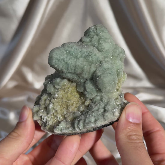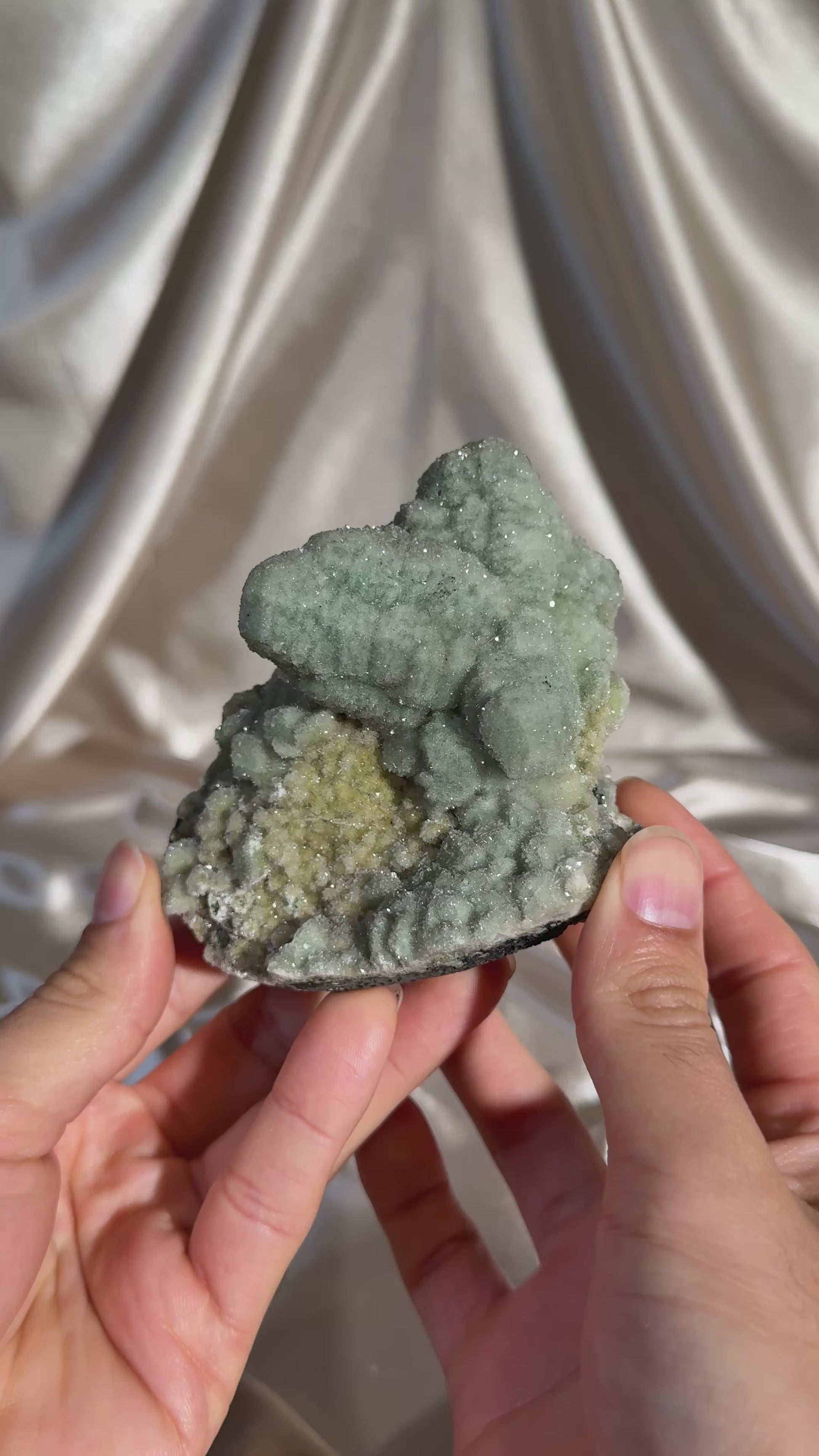 A recent discovery, trade-named Fairy Moss by me, this pocket showcases an unusual stacked Calcite formation reminiscent of the pagoda-style Calcite from China. The primary Calcite crystals are coated with a fine layer of Chalcedony (microcrystalline Quartz), which contains Chlorite inclusions giving a green hue. A second generation of small, transparent Calcite crystals grew over the surface, creating intricate layering. The combination of rare stacking morphology, green chalcedony coating, and overgrown calcite makes this a desirable specimen for collectors seeking both aesthetic beauty and unique mineral specimens.