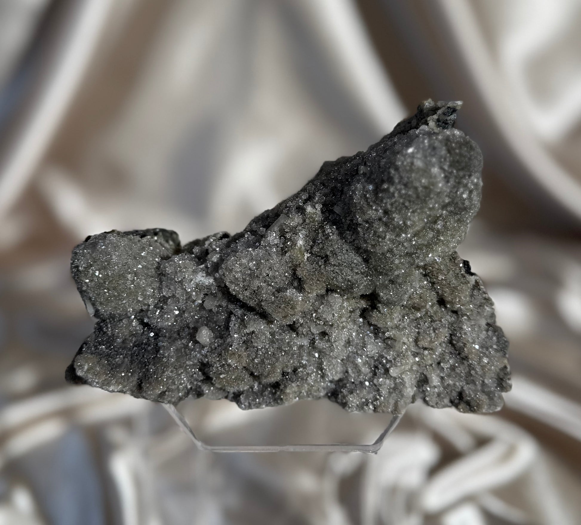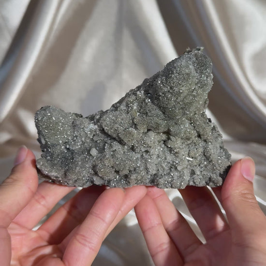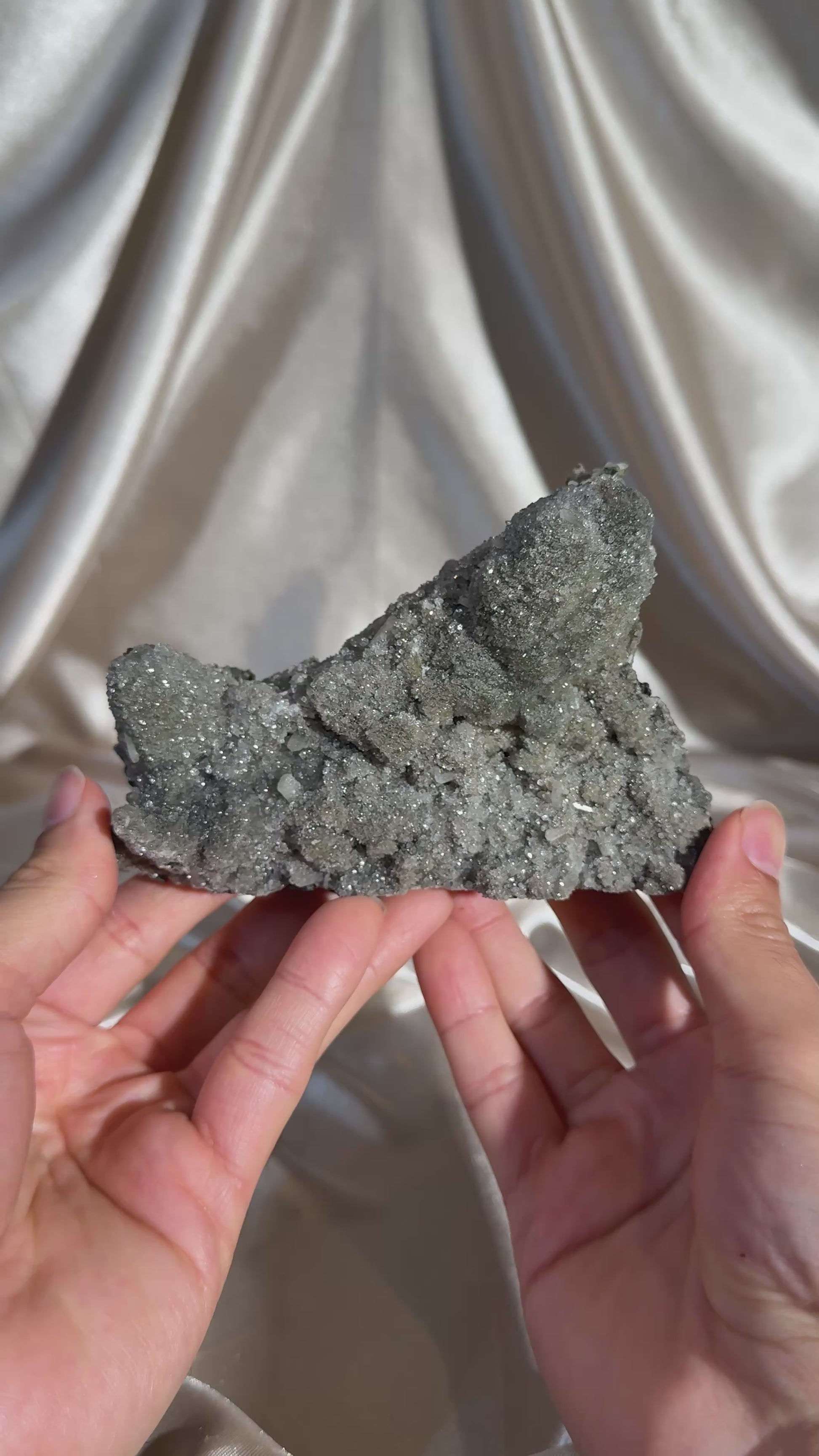 A recent discovery, trade-named Fairy Moss by me, this pocket showcases an unusual stacked Calcite formation reminiscent of the pagoda-style Calcite from China. The primary Calcite crystals are coated with a fine layer of Chalcedony (microcrystalline Quartz), which contains Chlorite inclusions giving a green hue. A second generation of small, transparent Calcite crystals grew over the surface, creating intricate layering. The combination of rare stacking morphology, green chalcedony coating, and overgrown calcite makes this a desirable specimen for collectors seeking both aesthetic beauty and unique mineral specimens.