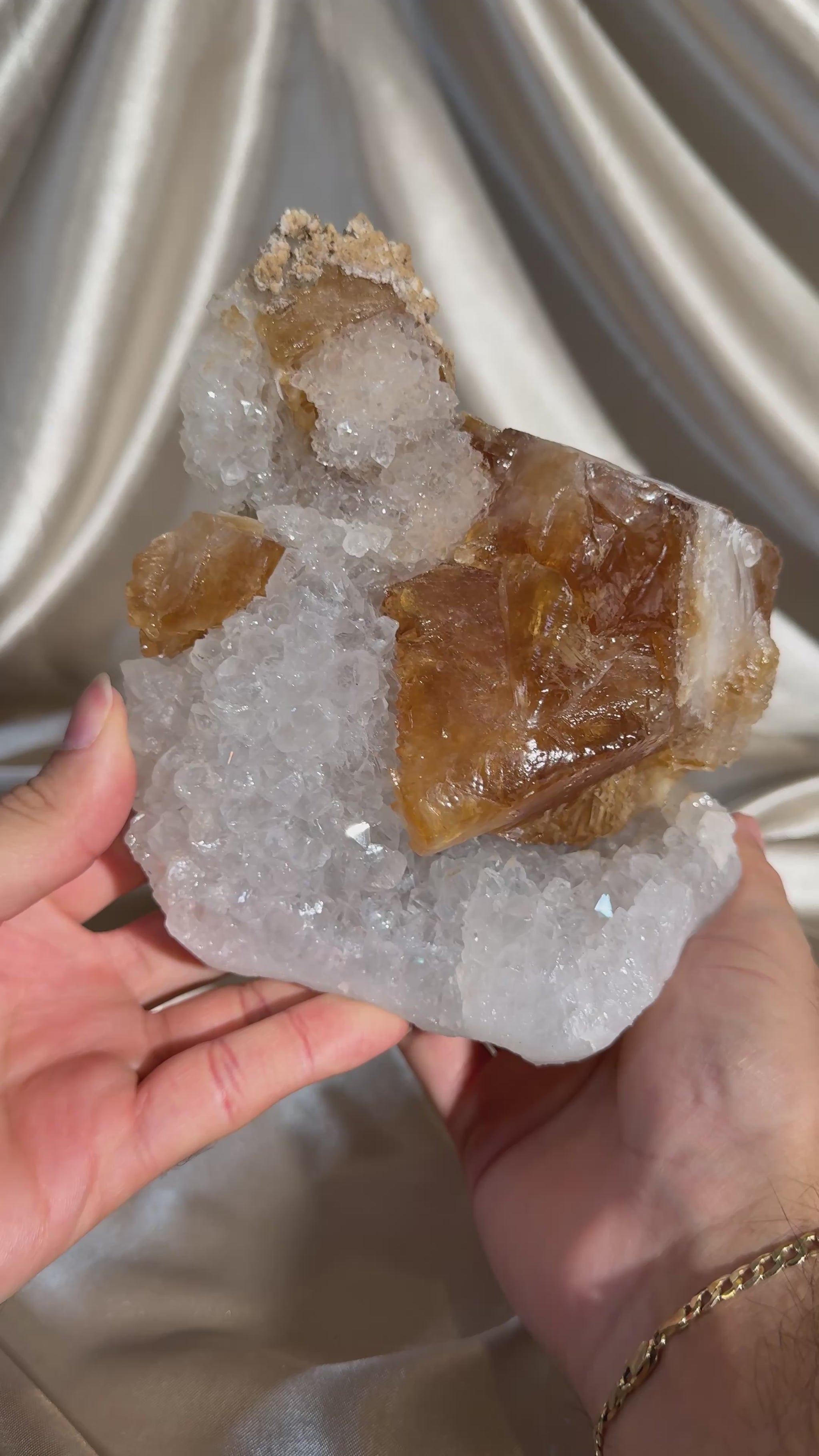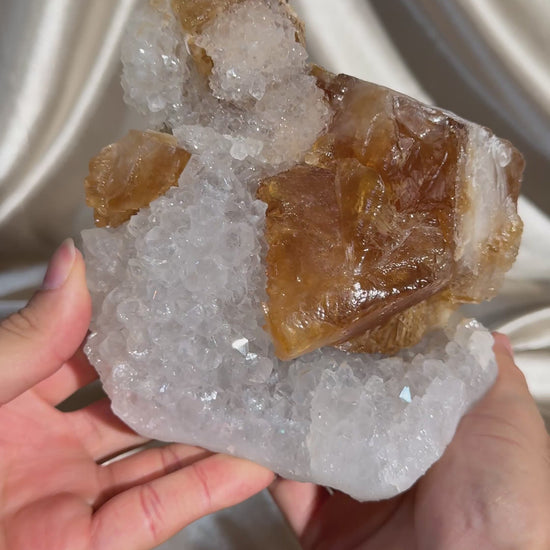 A breathtaking specimen featuring warm, golden honey calcite on large sparkling quartz base. The rich, honey-toned calcite contrasts strikingly with the quartz.