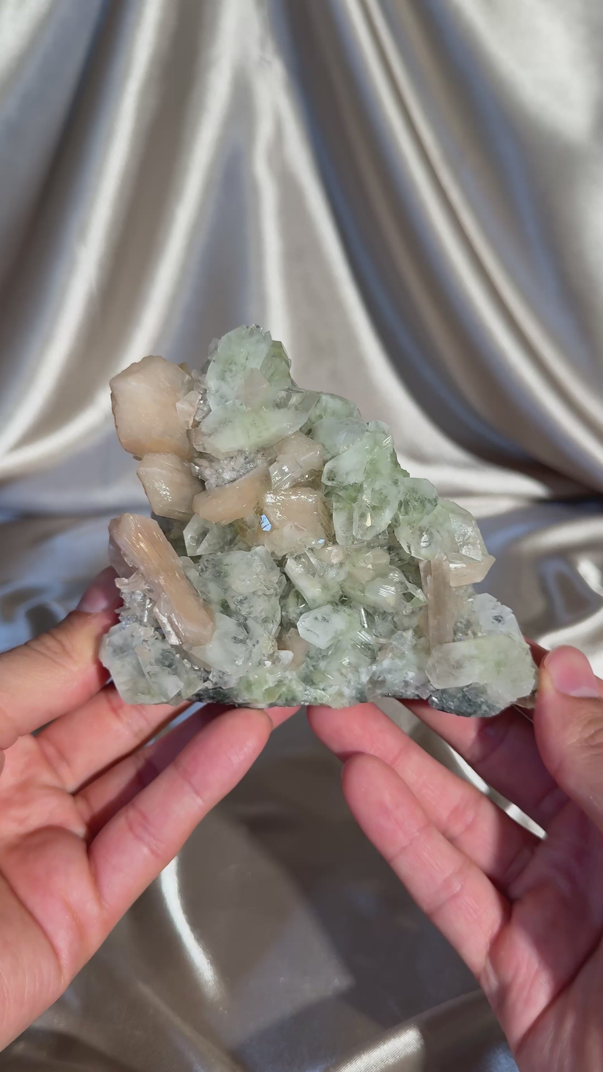 The ‘Ivy Thorn’ Pocket, named by me is distinguished by its striking green apophyllite crystals, noted for their exceptionally sharp terminations and glassy, transparent tips. Many crystals display a contrasting milky interior, creating an unusual two-tone effect that enhances their visual appeal. Several specimens also feature associated stilbite and calcite growth. This unique pocket highlights the fine crystal habits and remarkable paragenesis that make Indian apophyllite so highly regarded among collectors.