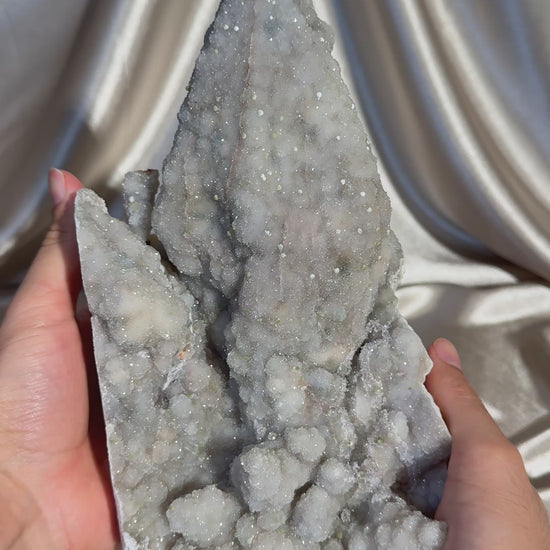 This piece has a small repair to the chalcedony crust on the left side. The calcite is fully intact and has not been repaired.