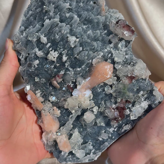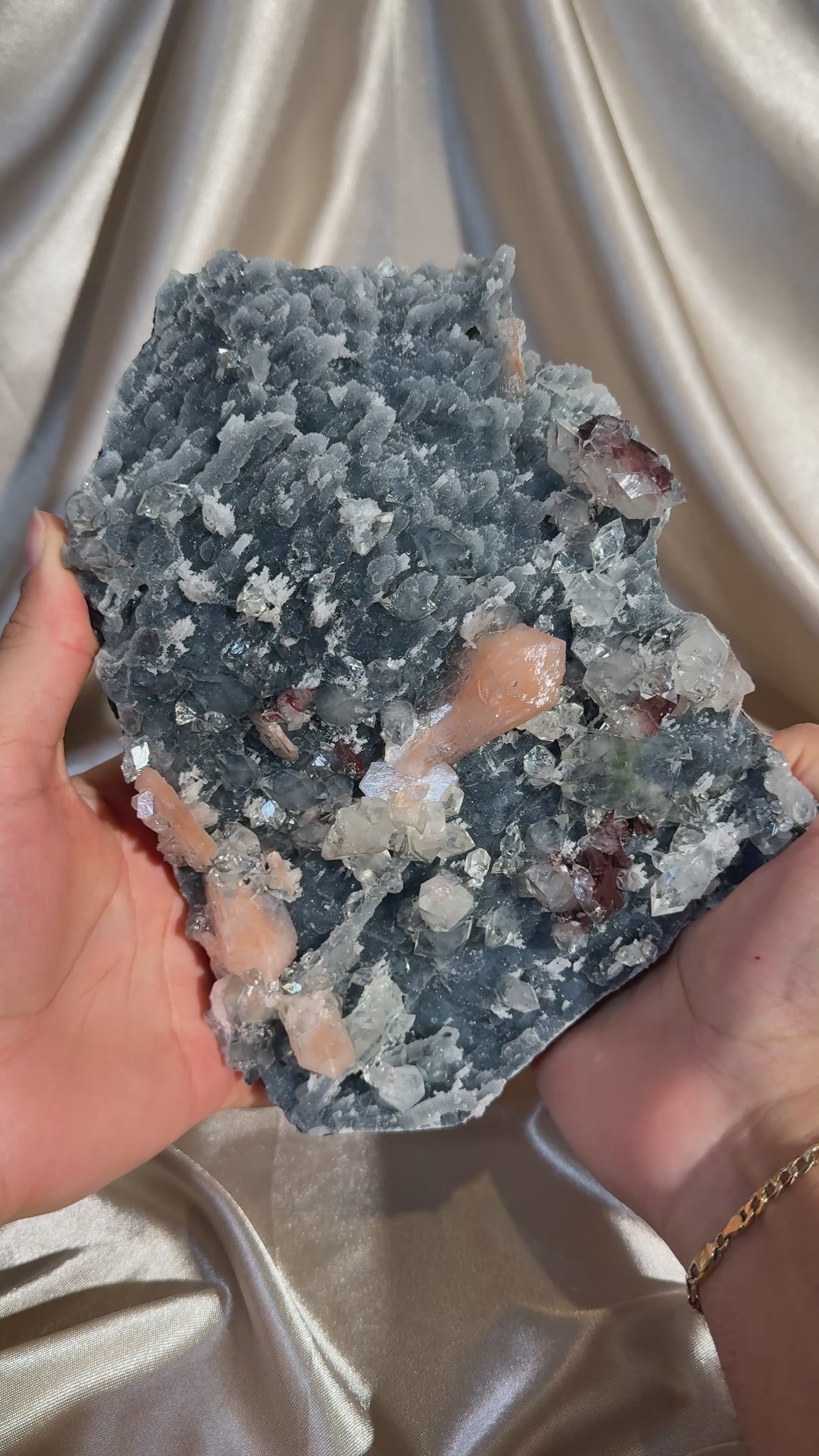 High-quality large navy blue chalcedony with diamond apophyllite, this specimen also features red heulandite and peach stilbite. From the renowned Jalgaon District, this specimen highlights the region’s intricate mineral growths and the interplay between chalcedony and zeolites.