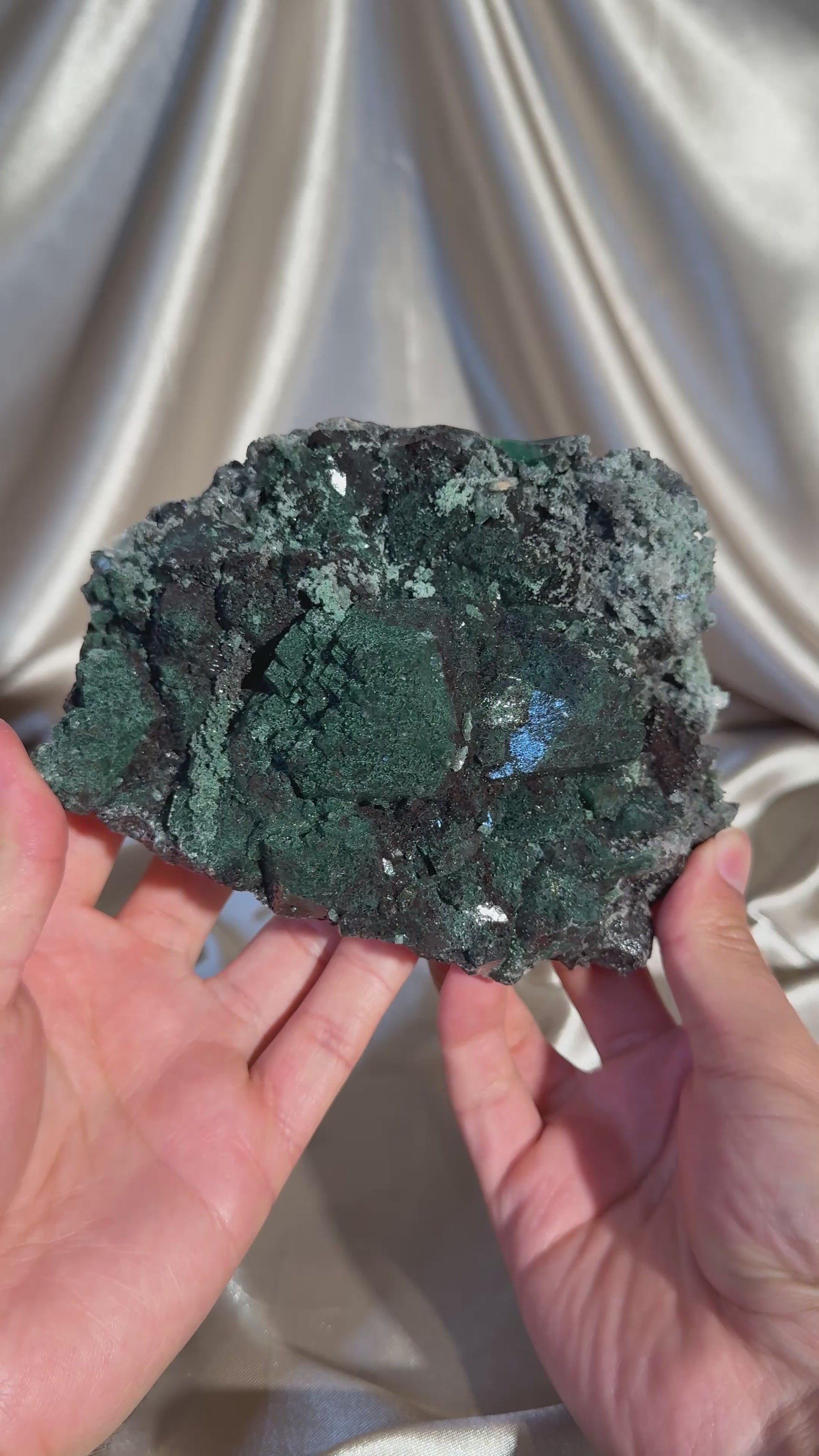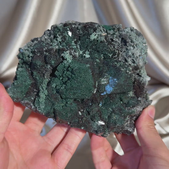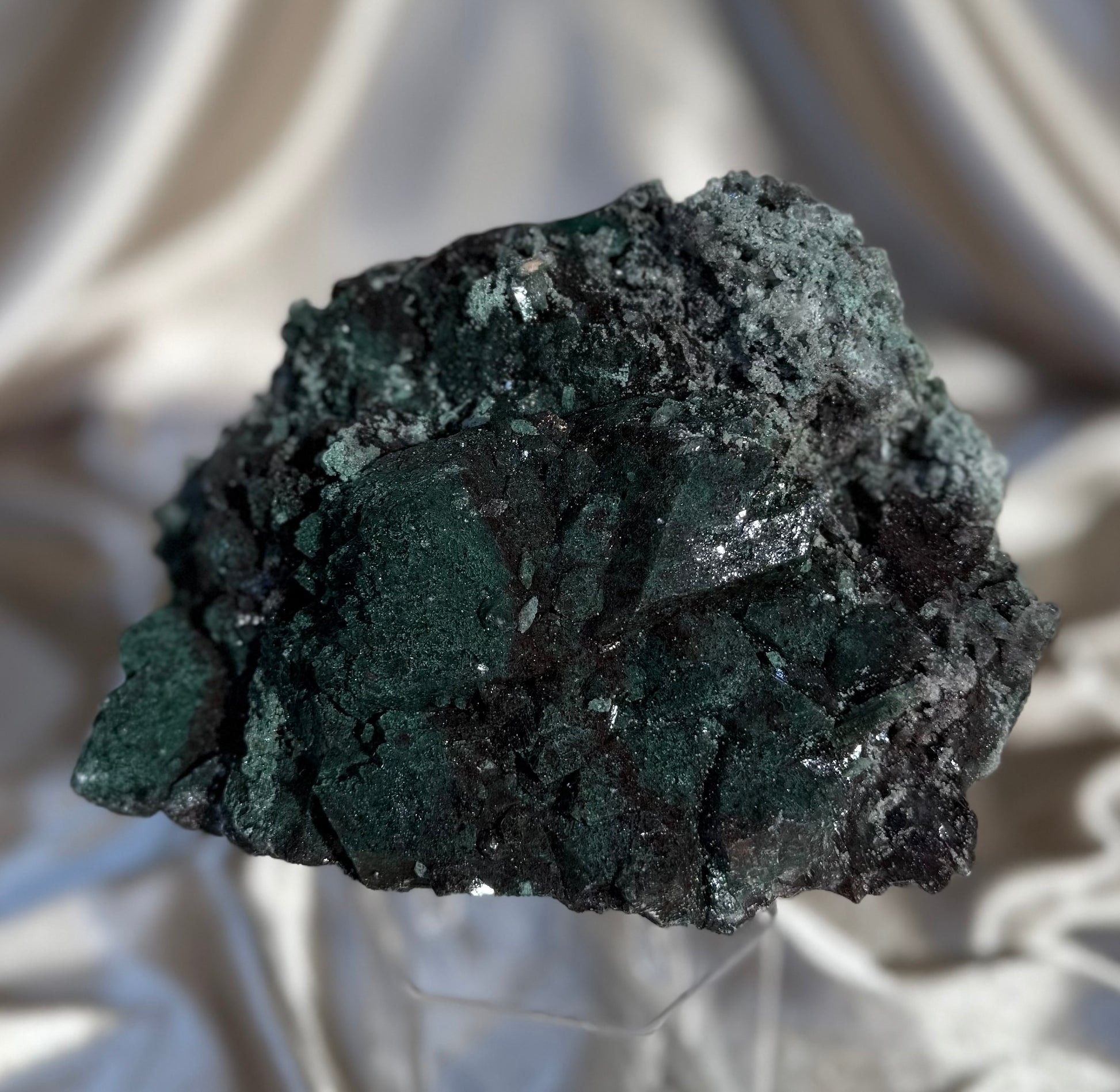 This apophyllite specimen features a soothing, marsh-like palette of greens and earthy undertones, hence where the trade name comes from. Sourced from India’s renowned Deccan Traps, the thick Celadonite, hematite inclusions & sharp terminations make Indian included apophyllite so highly prized by collectors.