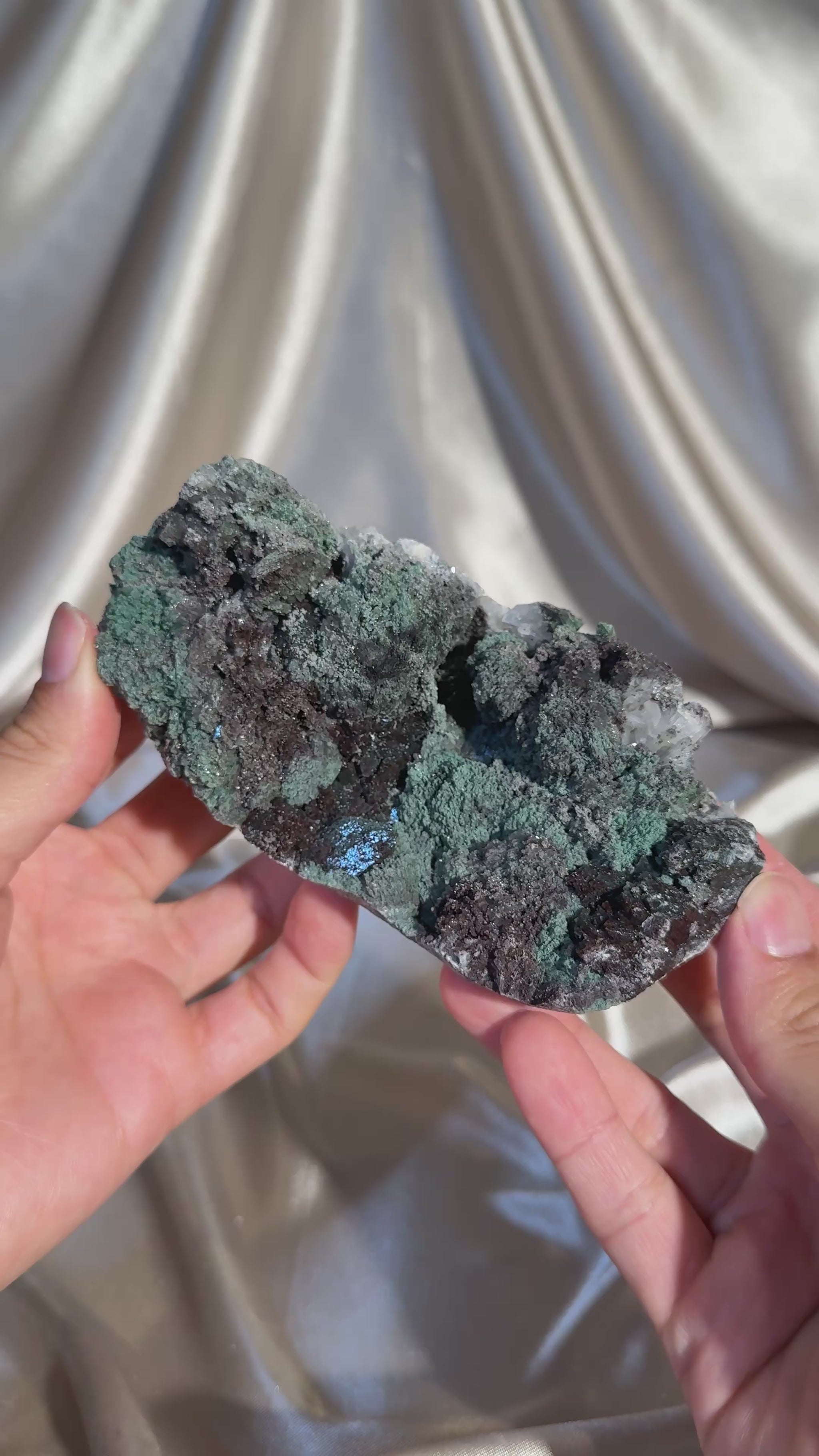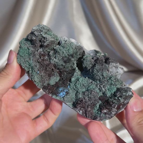 This apophyllite specimen features a soothing, marsh-like palette of greens and earthy undertones, hence where the trade name comes from. Sourced from India’s renowned Deccan Traps, the thick Celadonite, hematite inclusions & sharp terminations make Indian included apophyllite so highly prized by collectors.