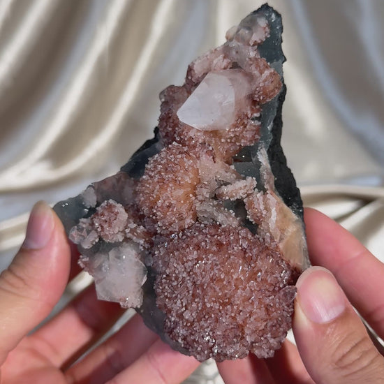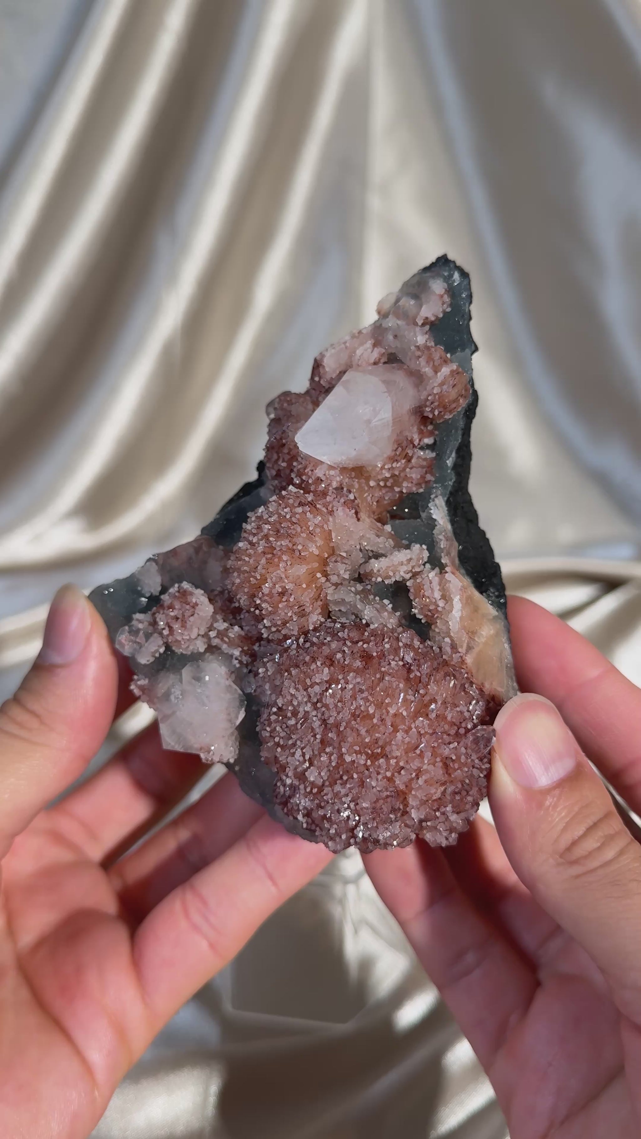 A impressive and uncommon combination, this specimen features vibrant red stilbite crystals on navy blue chalcedony. The bold contrast in color and texture makes this piece truly one of a kind and visually captivating.