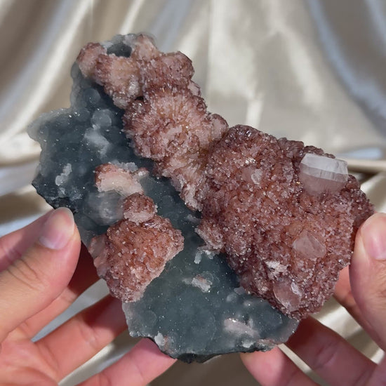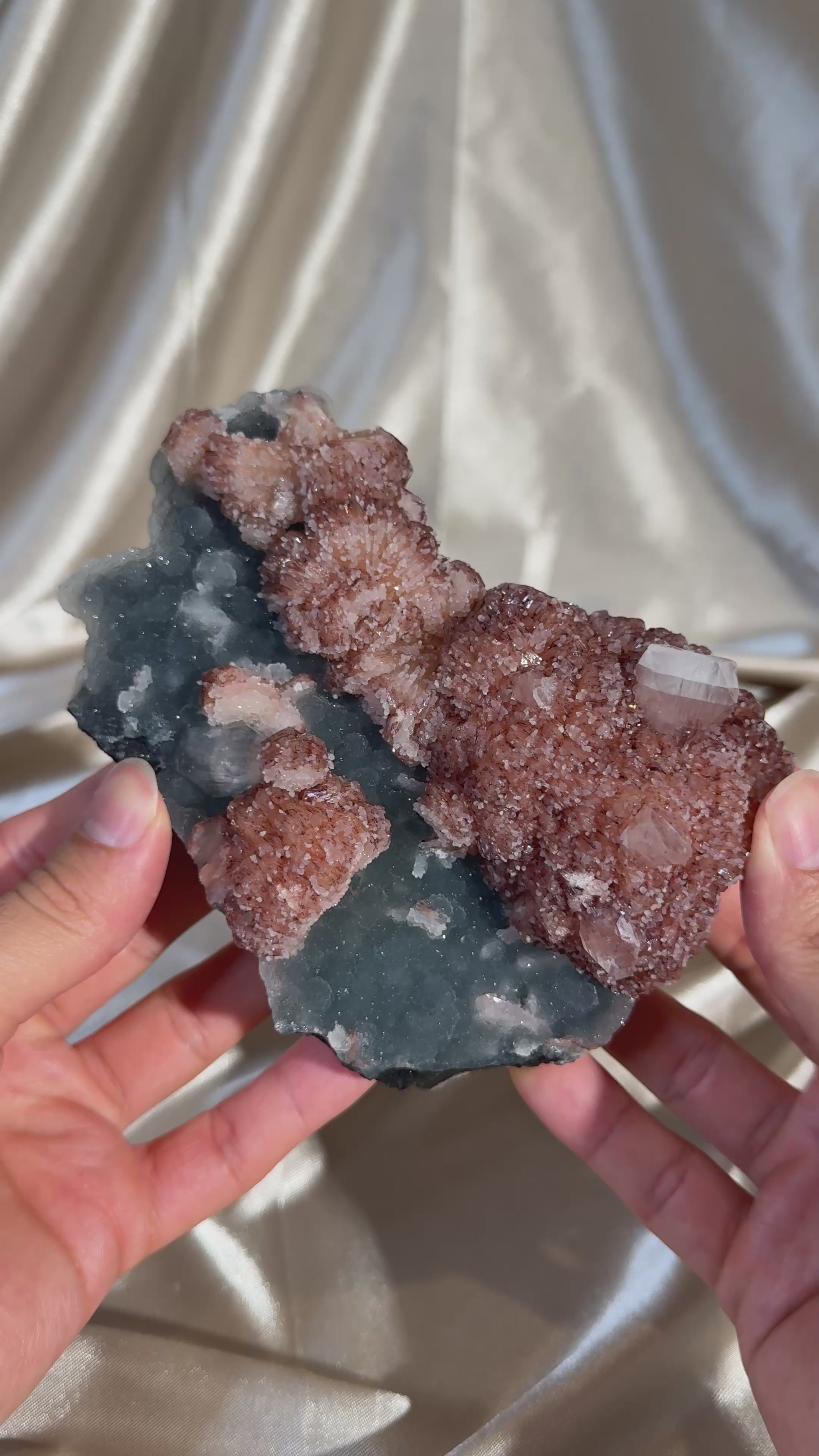A impressive and uncommon combination, this specimen features vibrant red stilbite crystals on navy blue chalcedony. The bold contrast in color and texture makes this piece truly one of a kind and visually captivating.