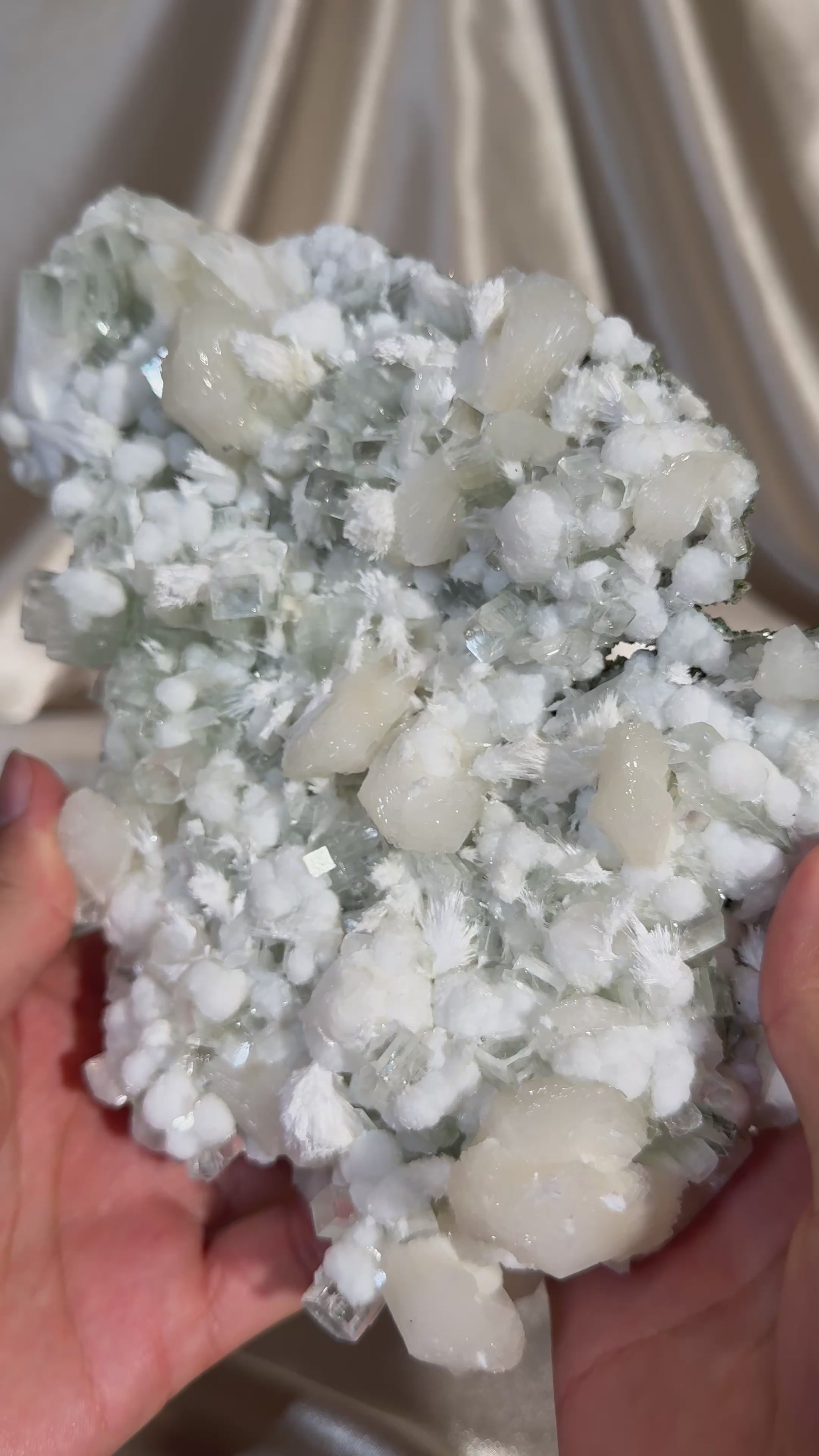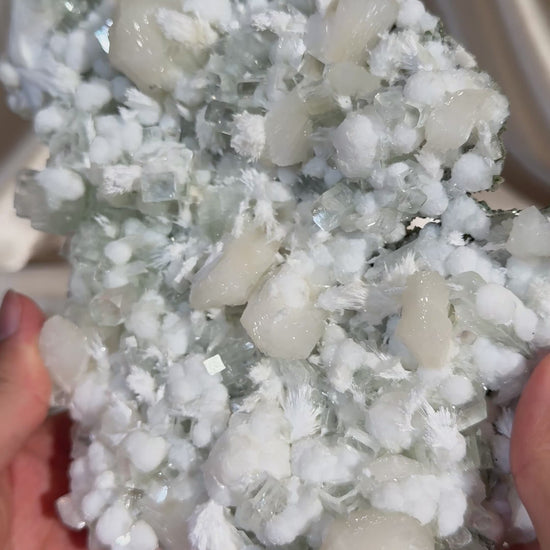 Trade named the “Sage bloom” pocket. This unique specimen features vibrant green apophyllite crystals accented with white mordenite, gryolite, and peach stilbite. The combination of colors and textures gives the piece a serene, natural aesthetic.