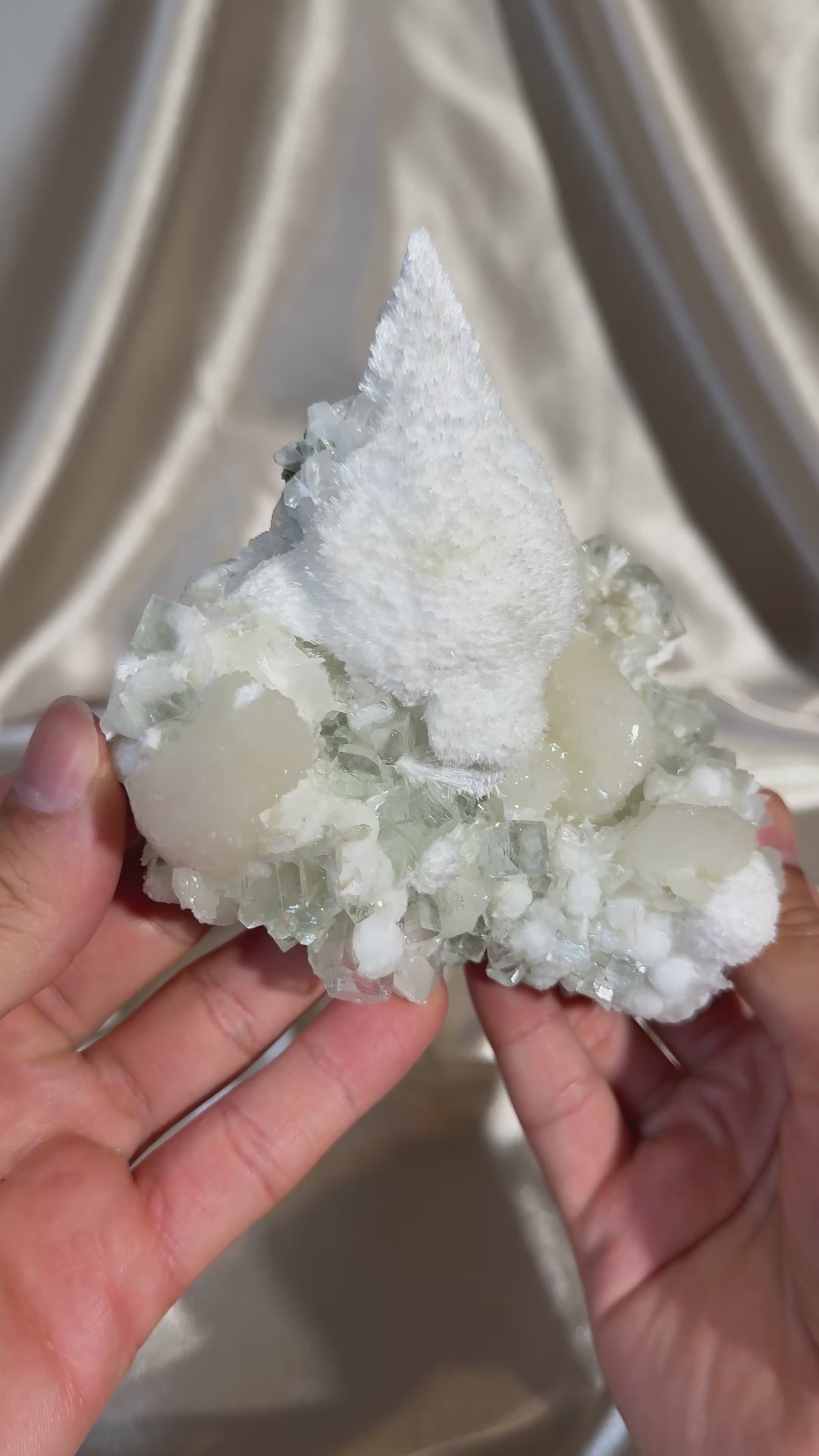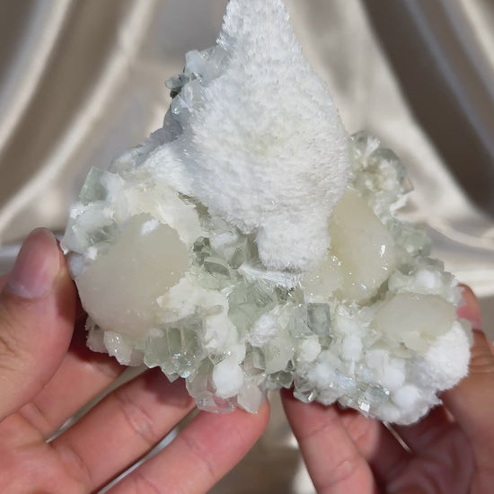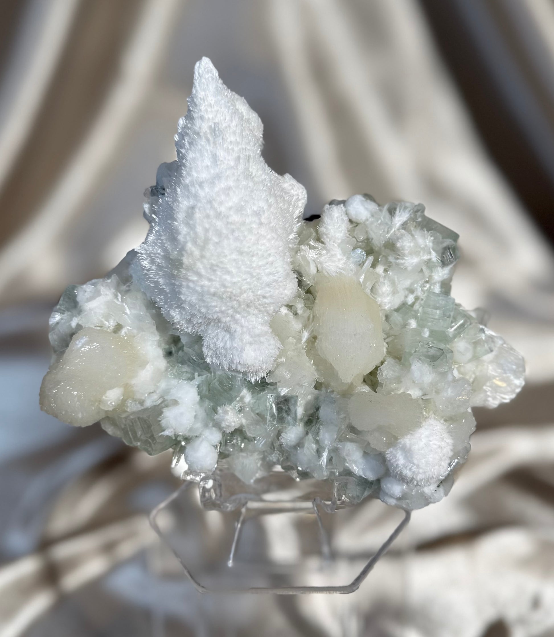 Trade named the “Sage bloom” pocket. This unique specimen features vibrant green apophyllite crystals accented with white mordenite, gryolite, and peach stilbite. The combination of colors and textures gives the piece a serene, natural aesthetic.