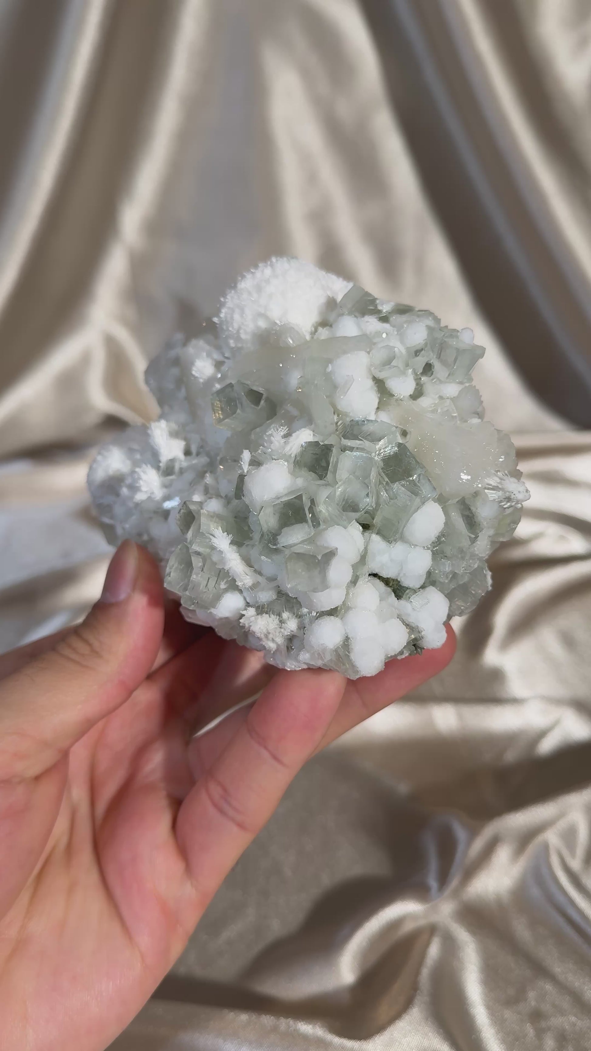 Trade named the “Sage bloom” pocket. This unique specimen features vibrant green apophyllite crystals accented with white mordenite, gryolite, and peach stilbite. The combination of colors and textures gives the piece a serene, natural aesthetic.