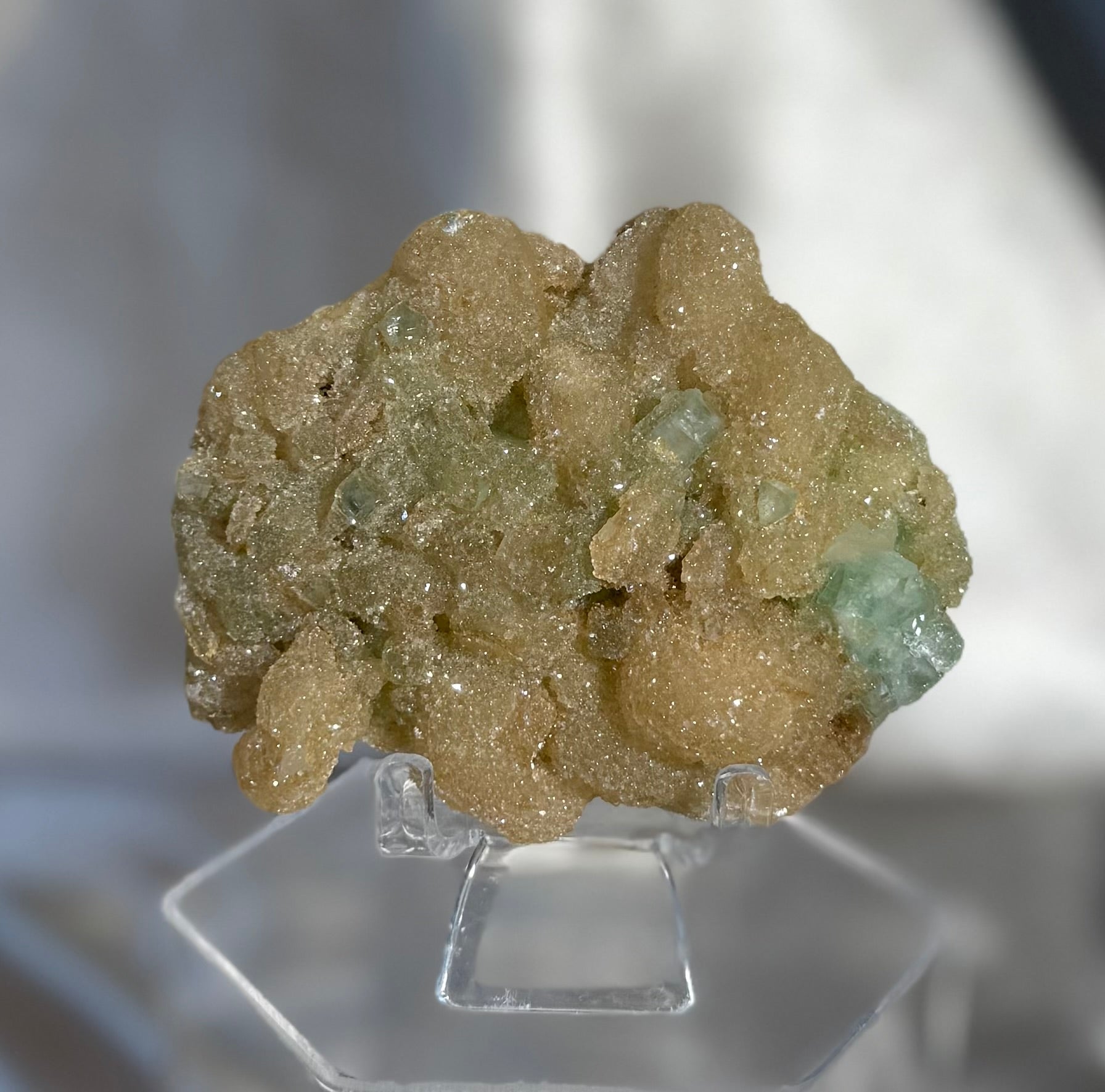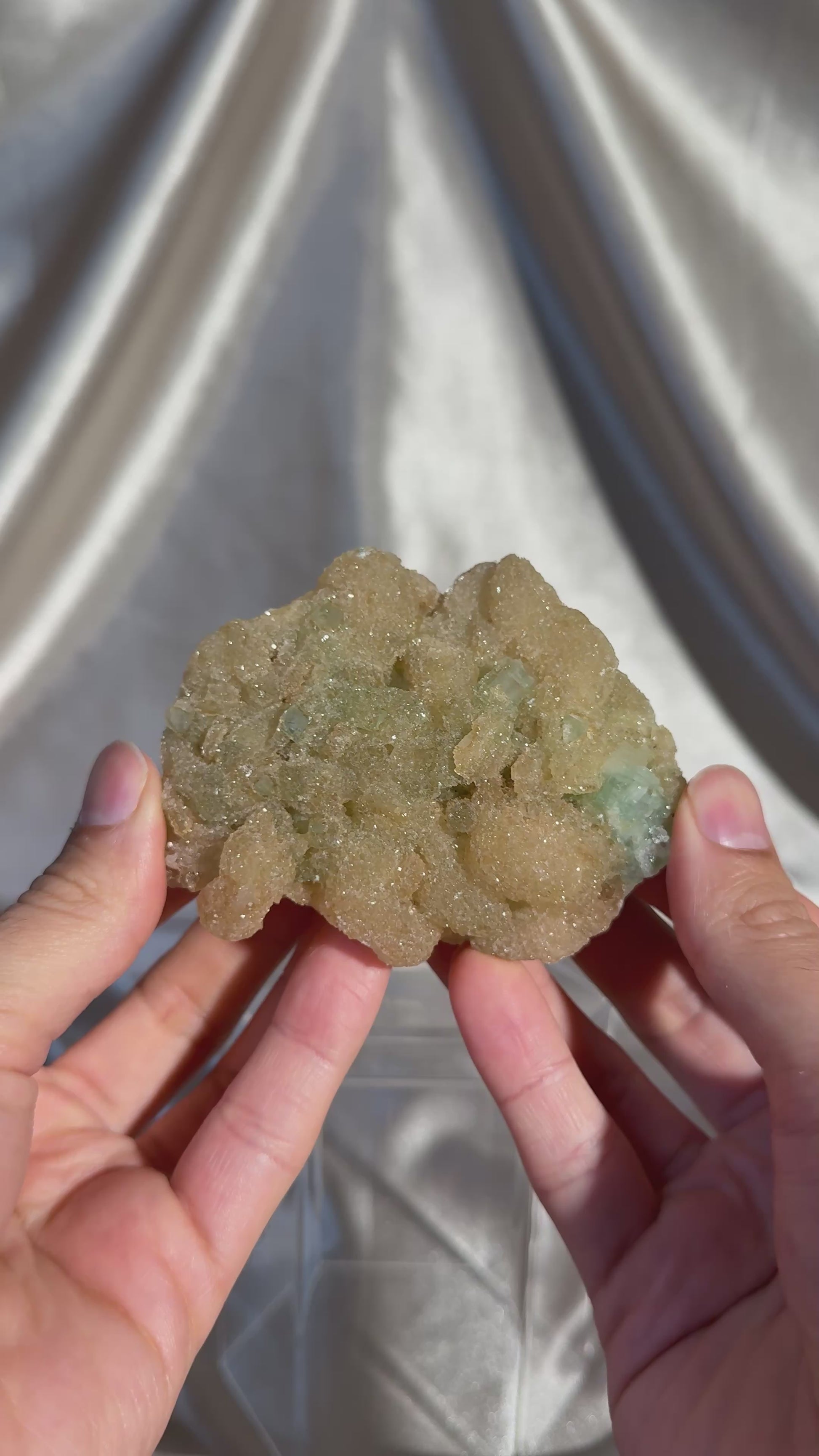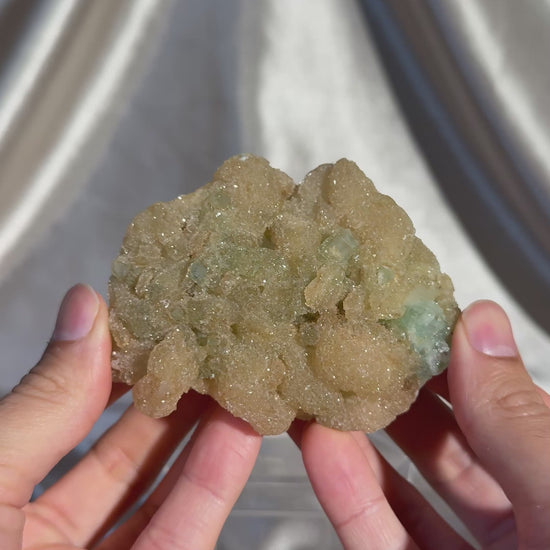White stilbite coated in a micro quartz layer that gives it a sugary shimmer, accented by bright green apophyllite from Ahmednagar, India. A fresh, eye catching combination with great texture and contrast.