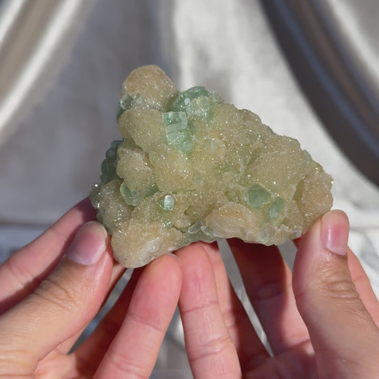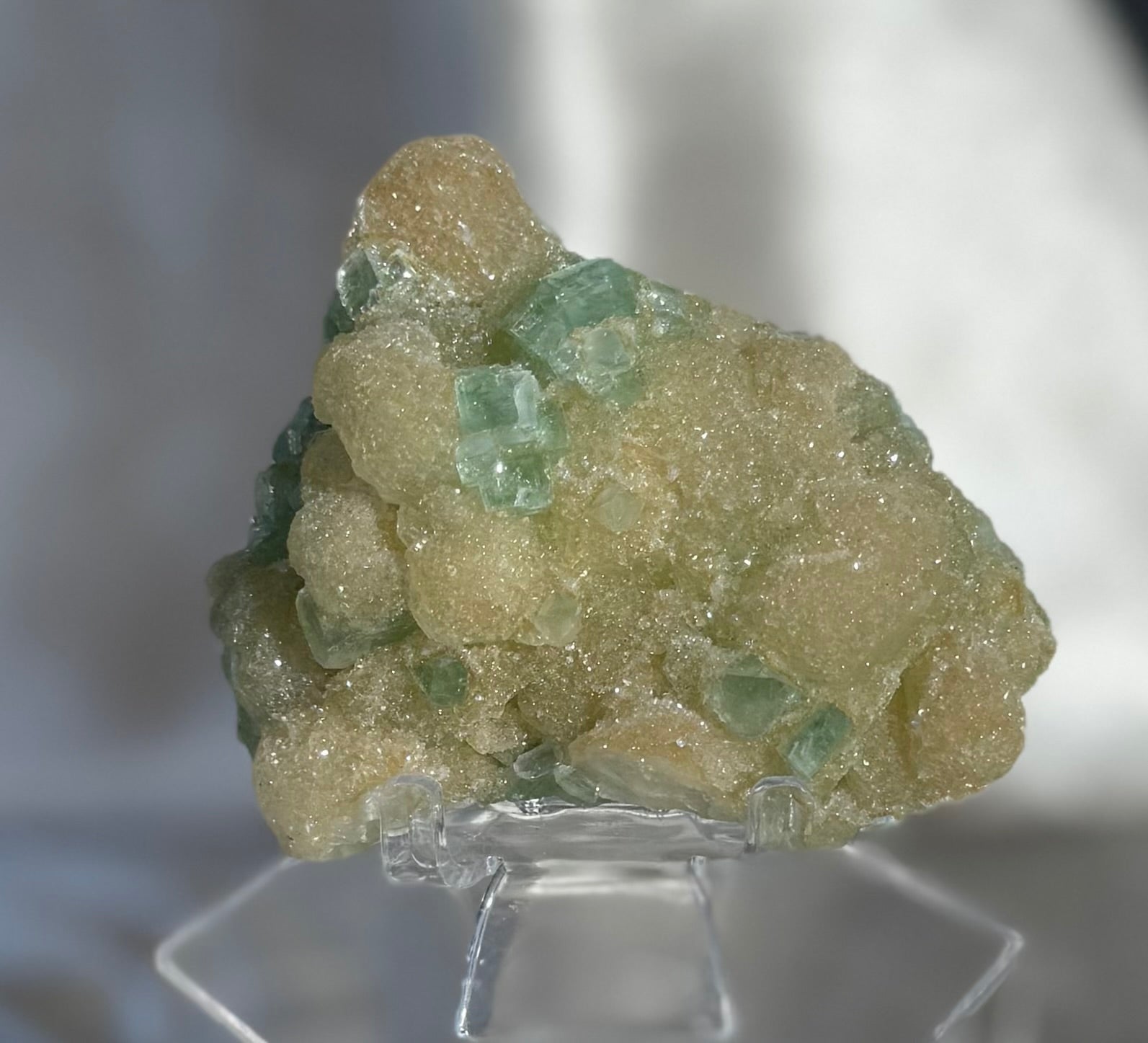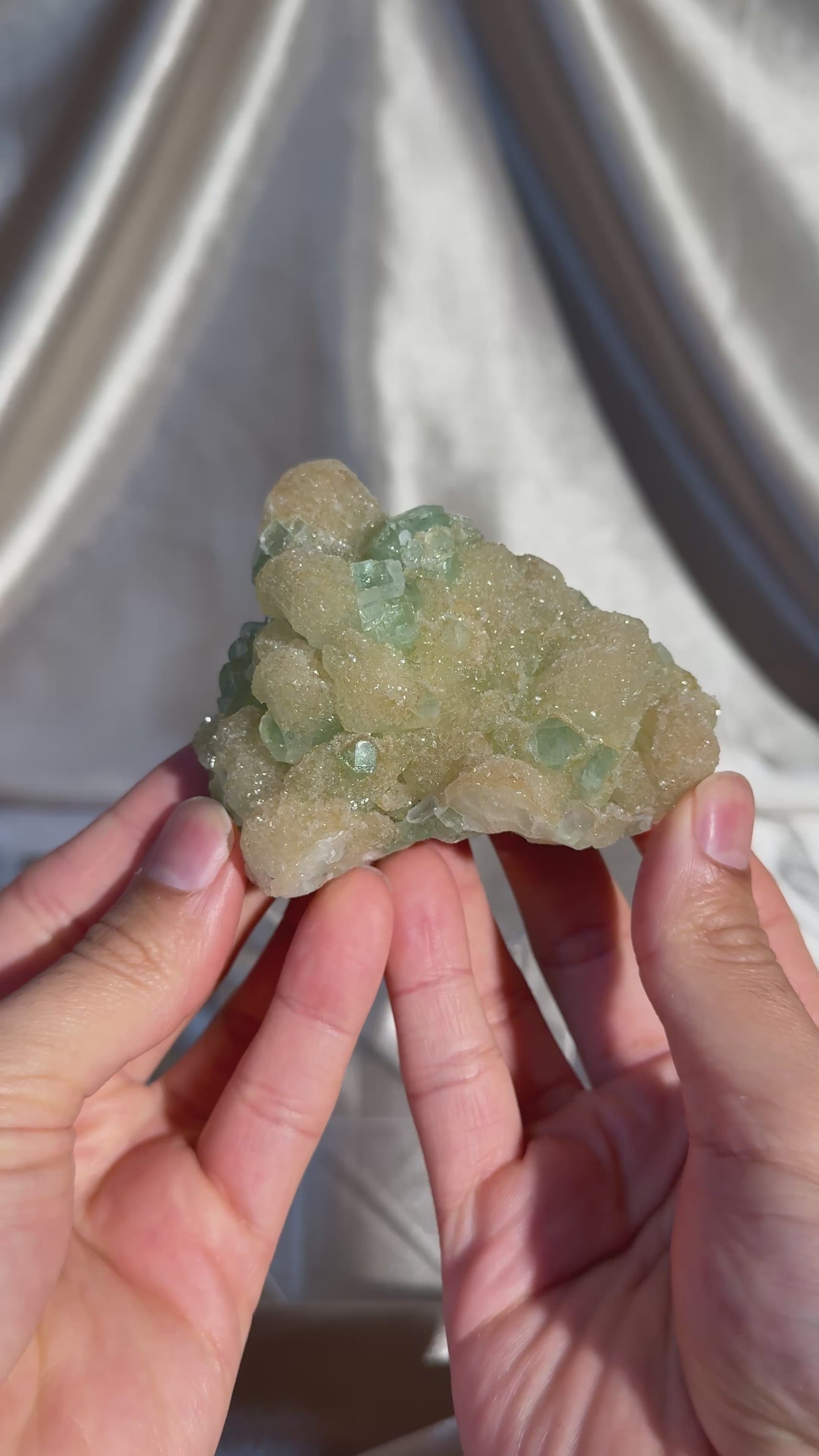 White stilbite coated in a micro quartz layer that gives it a sugary shimmer, accented by bright green apophyllite from Ahmednagar, India. A fresh, eye catching combination with great texture and contrast.