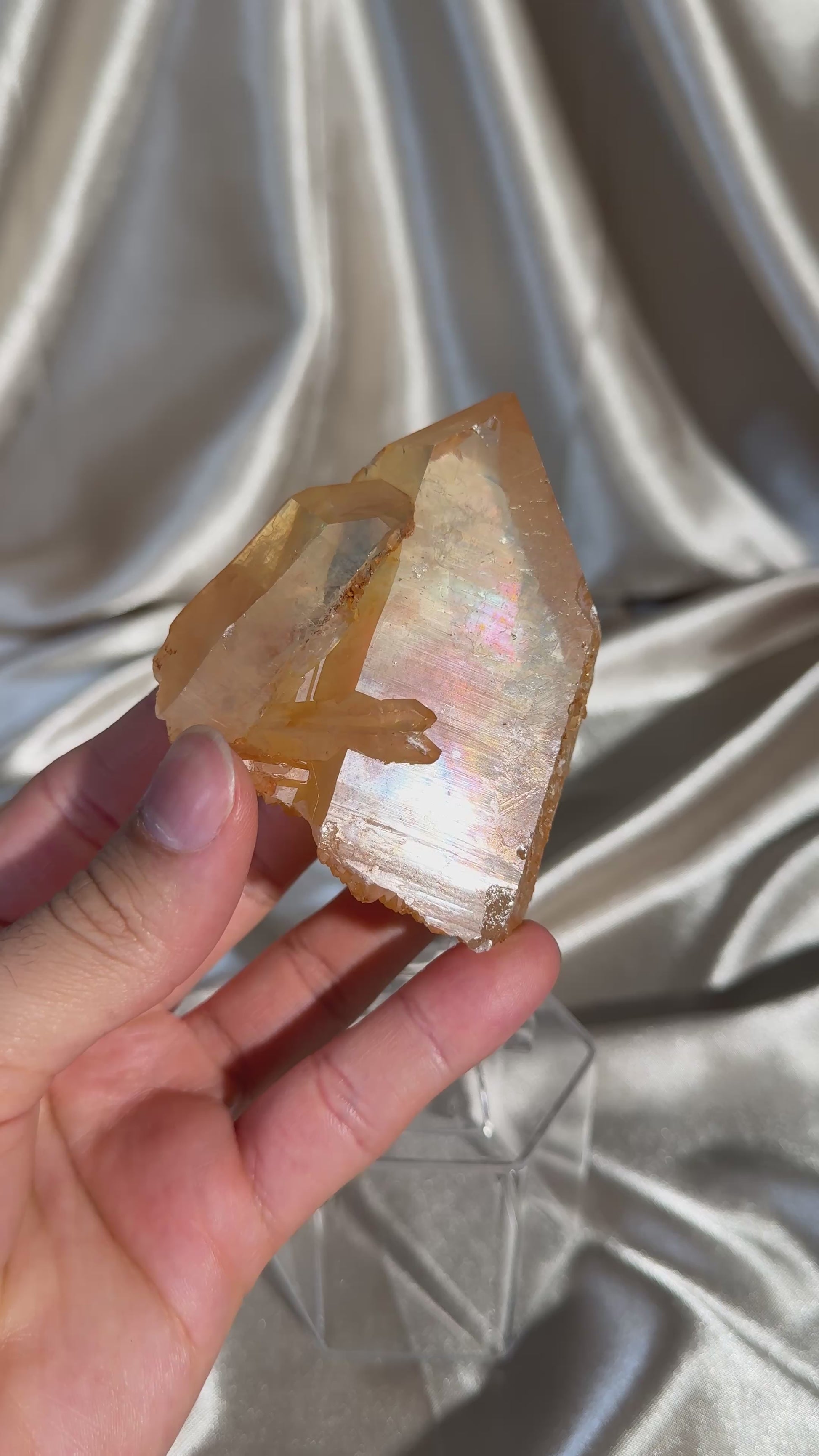 This vibrant quartz specimen gets its warm orange hue from a natural coating of iron oxide. This piece features a natural iridescence, adding a captivating shimmer to their surface. Sourced from Brazil.