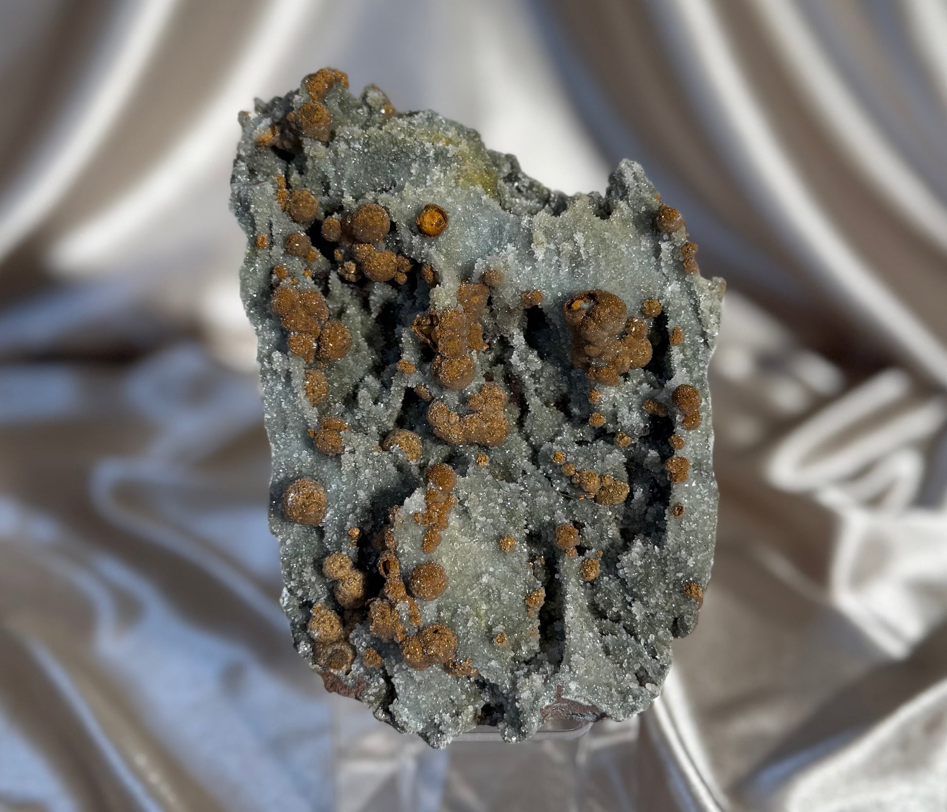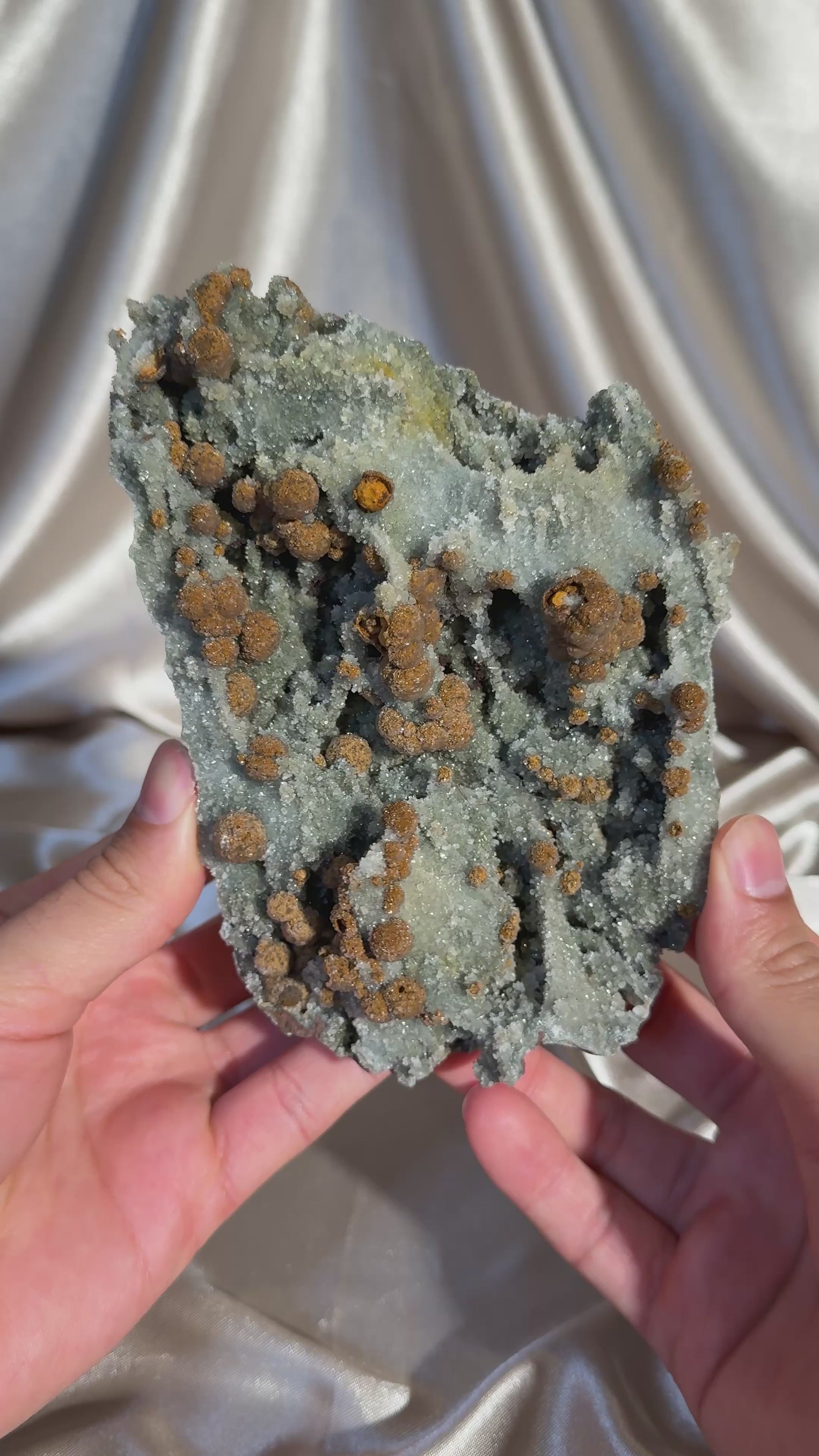 This material was trade names the Toadstool Pocket by me, this is an unusual and highly distinctive find. It features spherical aggregates of Gyrolite on a green chalcedony matrix, creating a striking visual contrast. In some specimens, there is a unique bladed calcite growth. This pocket has a similar appearance of forest fungi, inspiring the pocket’s name. This locality-specific combination makes it a noteworthy addition for collectors seeking uncommon Indian mineral associations.