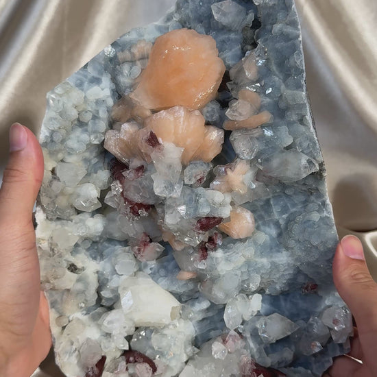 A breathtaking, large specimen of blue chalcedony. This impressive piece showcases an eye-catching combination of mineral textures and colors, featuring prominent peach stilbite, diamond apophyllite, coated dogtooth calcite, and vibrant red heulandite. A true showpiece from one of India’s most recognized localities.