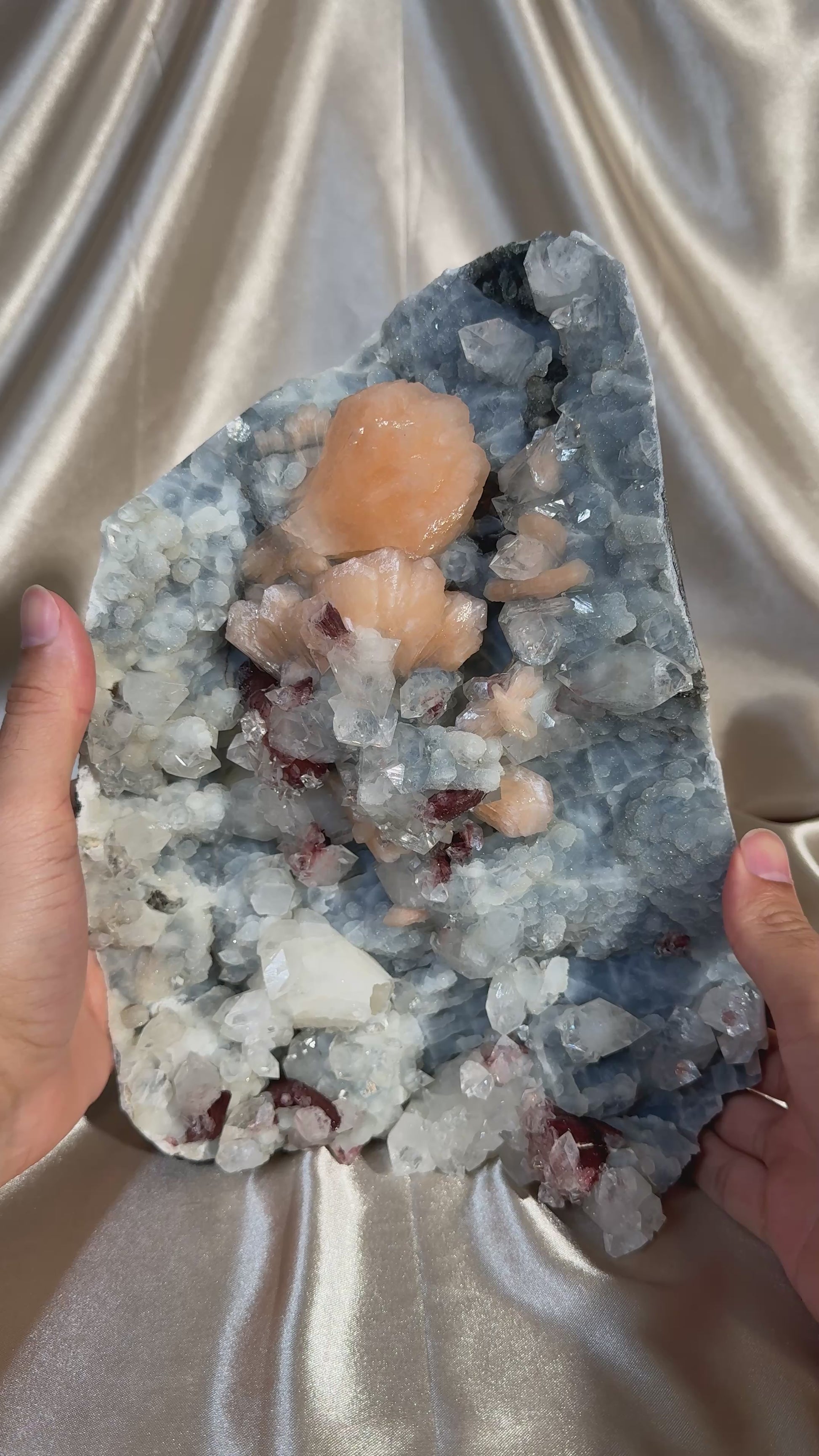 XL self standing blue chalcedony with stilbite, apophyllite, calcite & heulandite.